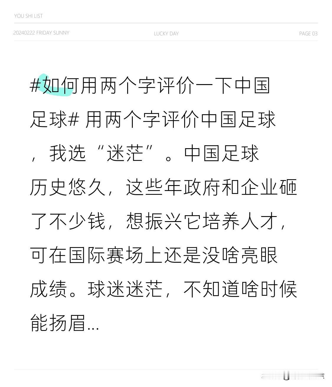 用两个字评价中国足球,我选“迷茫”。 中国足球历史悠久,这些年政府和企业砸了不少钱,想振兴它培养人才,可在国际赛场上还是没啥亮眼成绩。球迷迷茫,不知道啥时候能扬眉吐气;管理层也迷茫,发展方向似乎总找不准。技术、体制、文化等问题交织,就像在迷雾中摸索,不知道路在何方。