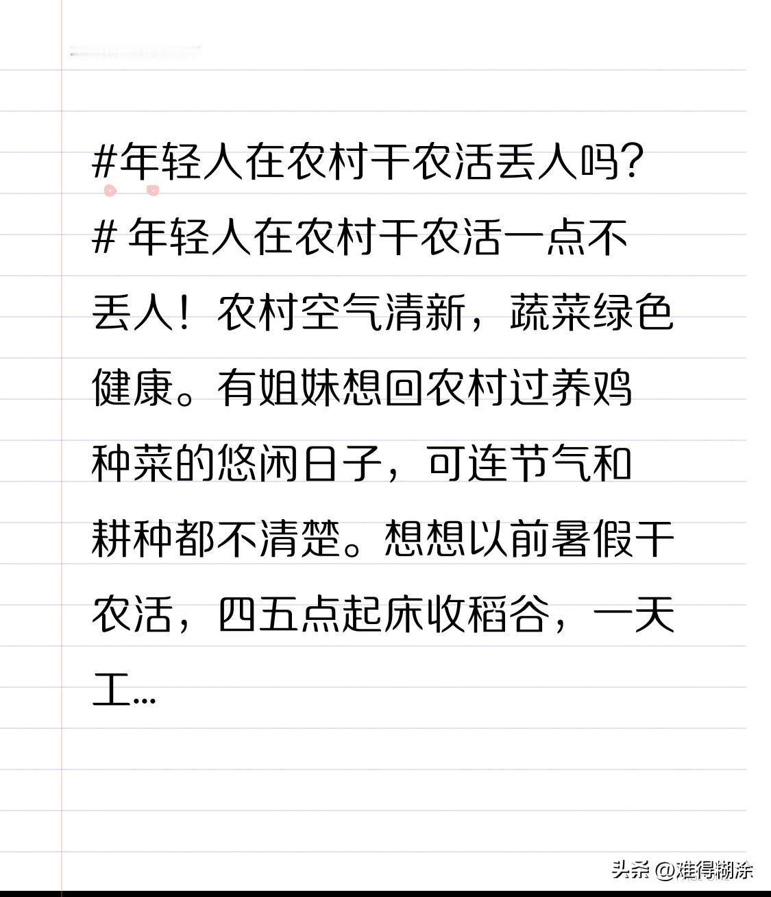 年轻人在农村干农活一点不丢人!农村空气清新,蔬菜绿色健康。有姐妹想回农村过养鸡种菜的悠闲日子,可连节气和耕种都不清楚。想想以前暑假干农活,四五点起床收稻谷,一天工钱才30。现在厂里百元一天年轻人都嫌累。小时候干农活是噩梦,干农活也是种经历和本事,不丢人!