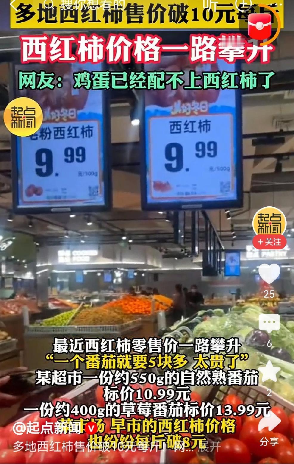 番茄炒蛋马上要成蛋炒西红柿了,我们炒菜一般都是便宜的炒贵的,现在很明显番茄已经贵过鸡蛋了。 这几次去超市买菜,去了几次看着十块左右一斤的番茄愣是没舍得下手,我一开始还以为是盒马价格标错了,或者就他们一家番茄贵。就想着回家奥乐齐买,我依稀记得奥乐齐番茄很便宜的。 没想到回家打开奥乐齐,价格还是差不多。但是小孩喜欢吃番茄炒鸡蛋,总不能十来块一斤的番茄就不吃了吧! 我记得好像现在肉也就差不多这个价格吧,看来以后还是多吃肉禽蛋吧!生酮饮食还健康!