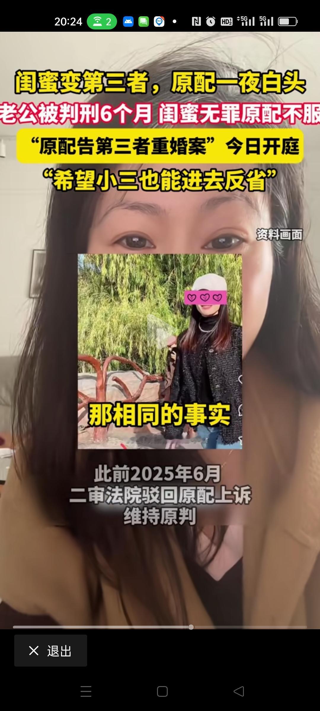 女子被闺蜜抢走老公后续:打胎记录暴露 第三者正脸曝光,瑜伽馆老板,且十分漂亮!面对闺蜜和丈夫的同时背叛,女主头发都白了,网友:“没有任何一个人能承受得住这种打击! 12月26日陕西安康被闺蜜抢走老公的“场子姐”的案件,有了新进展,她起诉闺蜜犯了重婚罪的案子今天开庭,她认为这一次她肯定会赢的官司的。 这一事件不仅搅动了网络上的舆论风暴,也深深触及了每个人内心深处对于友情和爱情的思考。女子的故事犹如一部现实生活中的悲剧,在信任崩塌和情感背叛的重重打击下,她的生活被彻底颠覆。被自己信任的闺蜜抢走丈夫,然而这还不是故事的终点,随着案件的进展,真相也逐渐浮出水面。 “场子姐”所承受的痛苦是难以言表的,面对闺蜜的背叛和丈夫的出轨,她不仅失去了爱情,更是被最亲近的人所伤害。这种双重打击让她的生活变得无比灰暗,头发早已白了,留下的只有心灵深处的创伤与愤怒。然而,正是这样的绝境,让她重新审视自己的内心,决定为自己争取应有的公正。 随着最新的调查进展,诸多不为人知的细节逐渐被曝光。原来,这位“第三者”不仅长相出众,还是一家瑜伽馆的老板,生活看似光鲜亮丽,但这样的外表掩盖不了她背后的心机与冷酷。在感情的争夺中,所谓的友情脆弱得不堪一击,面对一场原本纯真的友情和爱情之间的撕扯,让人深感惋惜。 女主意识到,自己并不孤单,许多网友纷纷为她发声,表示对她的理解与支持:“没有任何一个人能承受得住这种打击!”这样的共鸣更加强了她对法律的信心,她深知,正义不会迟到,眼前的痛苦终将会过去。 如今,她起诉闺蜜重婚罪的案子进入庭审阶段,尽管这条路充满坎坷与挑战,但她已不再是当初那个被背叛、无助的女人。她在重建自己的生活,努力让自己站起来,重拾自信。这场官司,已不仅仅是为了报复和愤怒,更是一种对自我尊严的捍卫。 在这场官司中,她希望能唤醒更多人对感情忠诚和信任的重视。爱情与友情的背叛带来的伤害,不仅仅是失去,更是人心的冷漠。通过自己的故事,她希望能警醒更多人,让每个人都明白,珍惜身边的每一份情感,不要等到失去后才追悔莫及。 无论结果如何,“场子姐”的勇气与坚定,都将激励着无数在感情中受伤的人,学会为自己发声,勇敢争取属于自己的幸福。最终,我们希望通过这样的事件,能够让更多人反思人与人之间的信任和真实,也期待她能在未来的日子里,找到更适合自己的幸福。女子被闺蜜和老公同时背叛 出轨老公被判刑的6个月