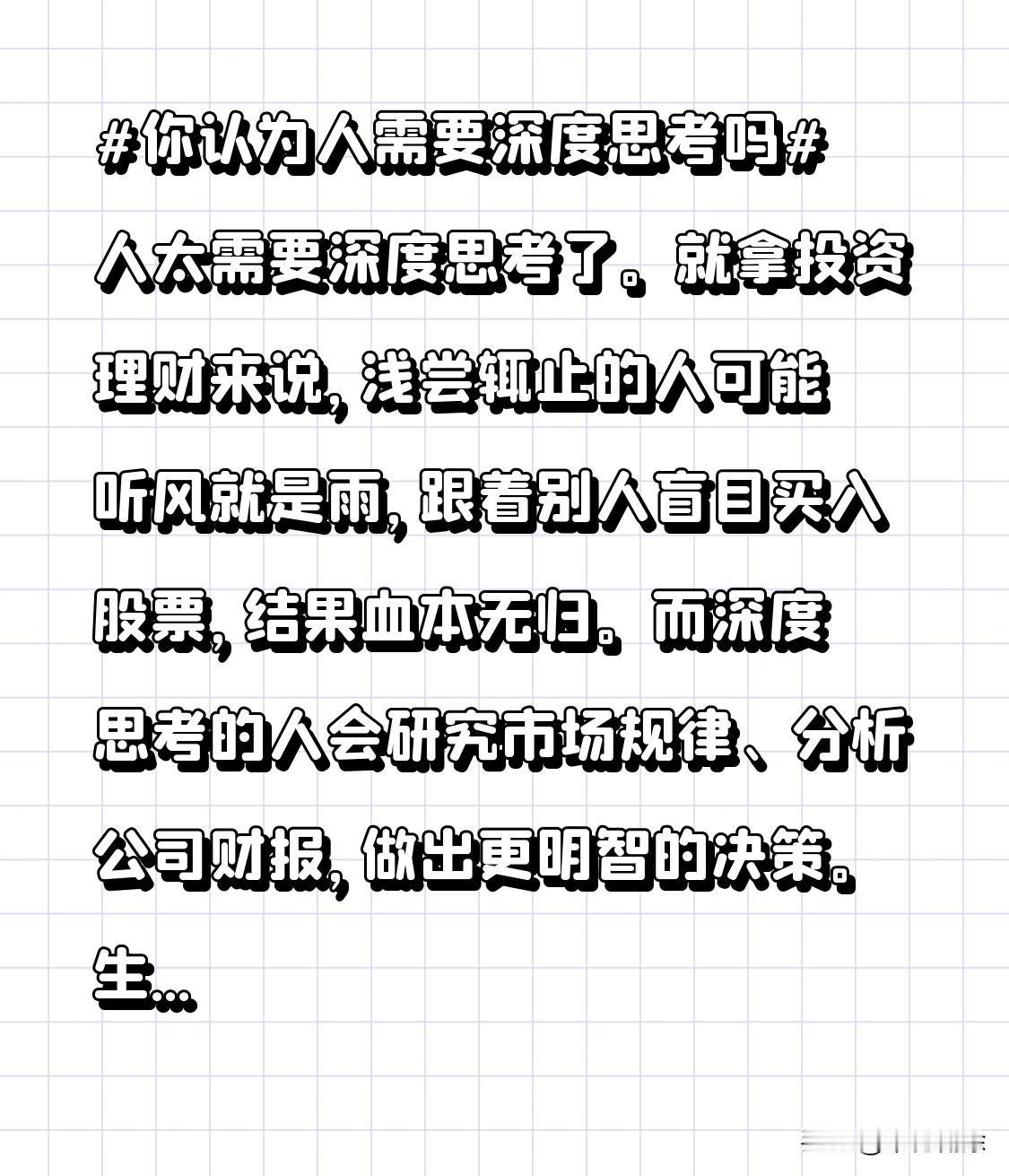 人太需要深度思考了。就拿投资理财来说,浅尝辄止的人可能听风就是雨,跟着别人盲目买入股票,结果血本无归。而深度思考的人会研究市场规律、分析公司财报,做出更明智的决策。生活中也是,遇到问题深度思考,能找到根源,避免重复犯错。深度思考就像给大脑升级,让我们活得更明白。