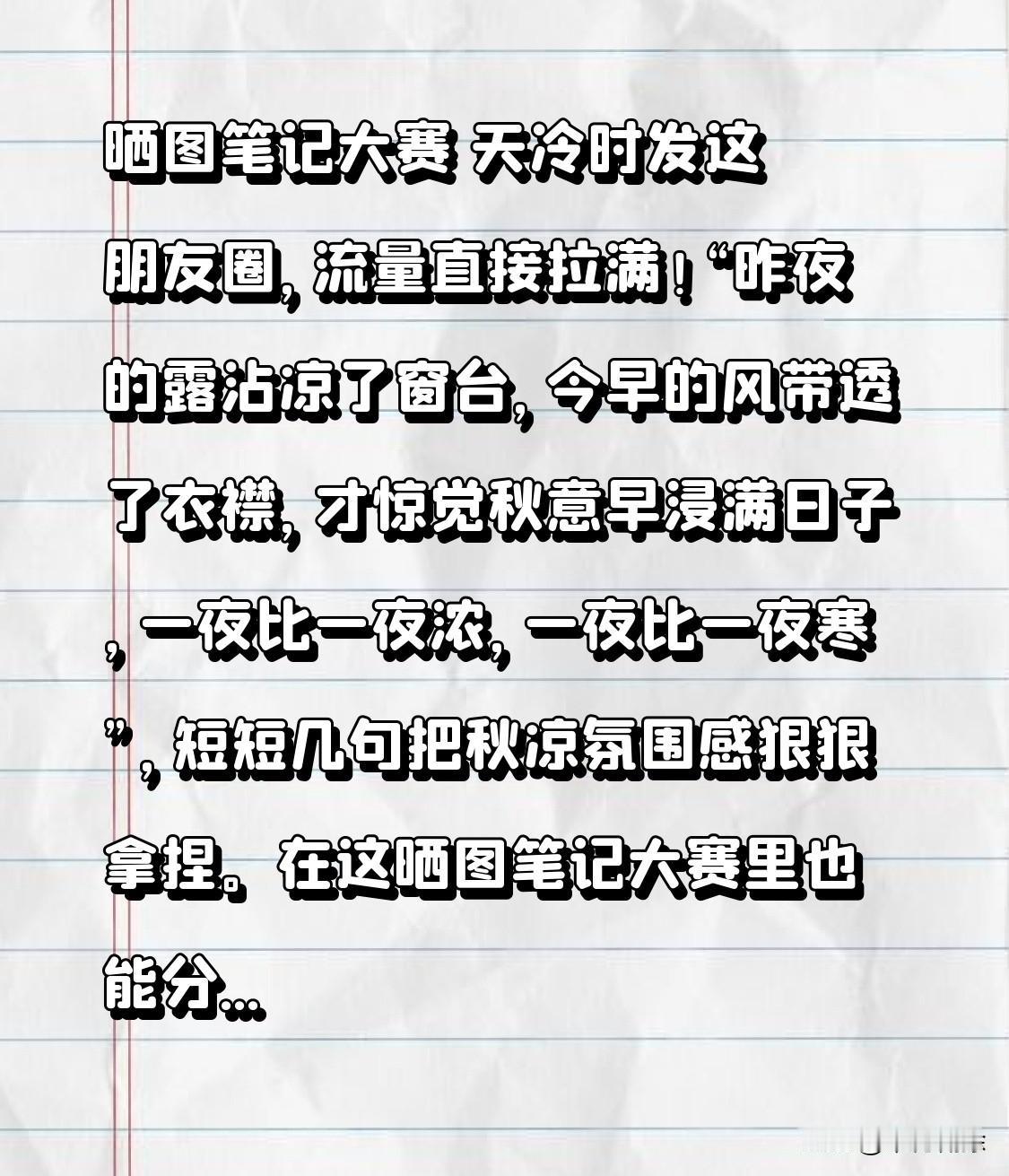 晒图笔记大赛 天冷时发这朋友圈,流量直接拉满!“昨夜的露沾凉了窗台,今早的风带透了衣襟,才惊觉秋意早浸满日子,一夜比一夜浓,一夜比一夜寒”,短短几句把秋凉氛围感狠狠拿捏。 在这晒图笔记大赛里也能分享春日美好,“伊人单车披霞追光,闯进渐次晕染的绿壤”,春日骑行画面感十足。不同季节不同美,都值得用文字和照片记录!