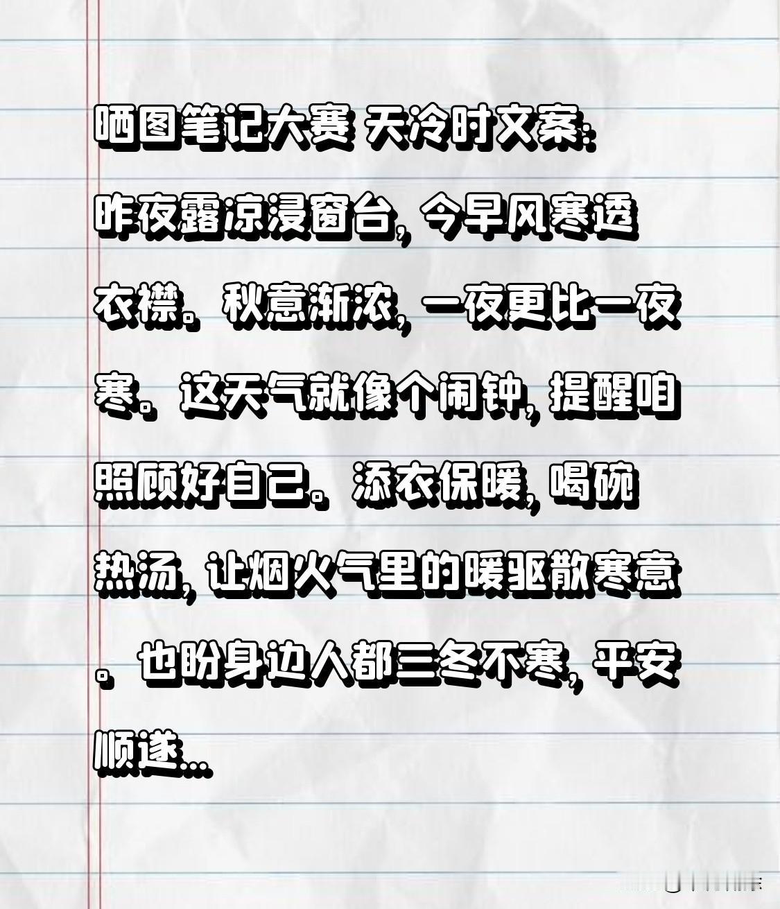 晒图笔记大赛 天冷时文案:昨夜露凉浸窗台,今早风寒透衣襟。秋意渐浓,一夜更比一夜寒。这天气就像个闹钟,提醒咱照顾好自己。添衣保暖,喝碗热汤,让烟火气里的暖驱散寒意。也盼身边人都三冬不寒,平安顺遂。 春日文案:春日打卡正当时!伊人单车追光,闯入绿壤。花草向车轮问好,晨露藏着碎金般的笑。村庄炊烟、白墙灰瓦,野花铺就彩色路标。单车上那抹黄,灵动了春景诗行,太适合晒图记录啦!