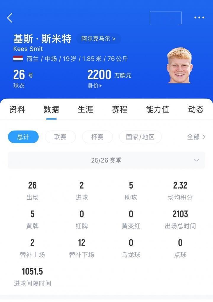 关于球员转会,阿尔克马尔掌握着主动权,因为斯米特的合同直到2028年。因此,阿尔克马尔并不急于出售。据TheAthletic披露,这家荷兰俱乐部要价接近6000万欧元。