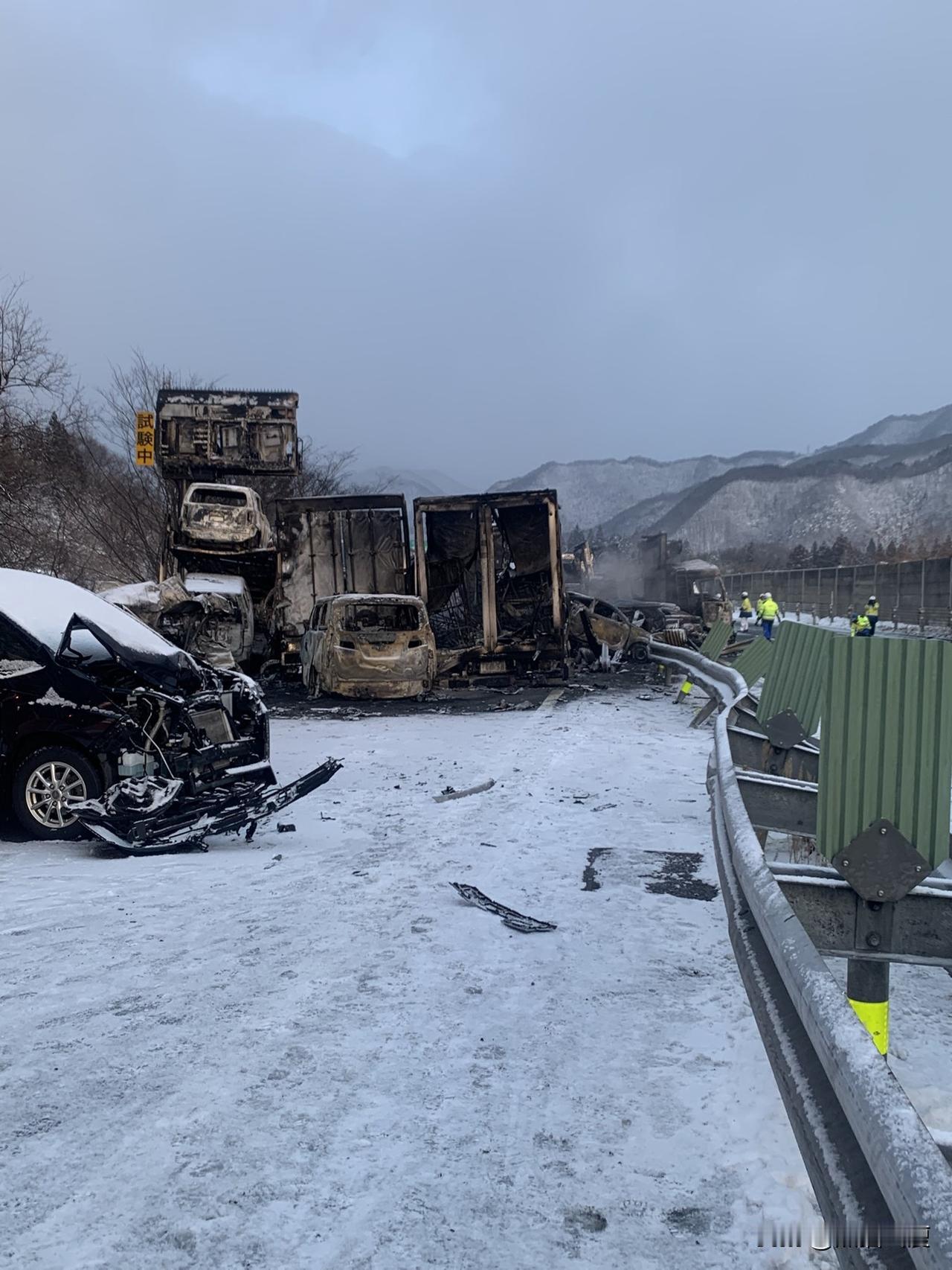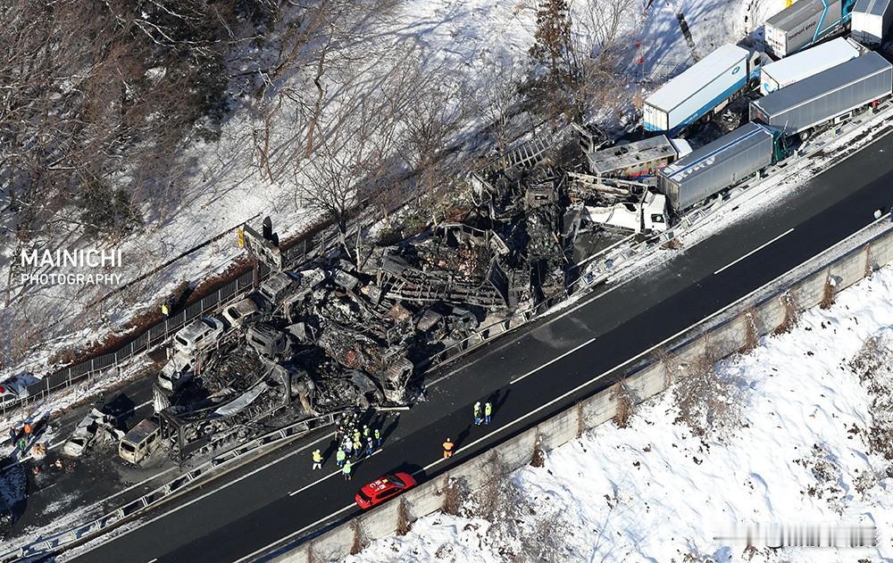 日本高速上发生涉及50余辆车(包括卡车和轿车)的多车连环相撞事故。 群马县水上町关越高速公路出城方向,两辆卡车相撞后引发连锁反应,最终50多辆车被波及。 该高速双向各两车道,如此多的车辆相撞,说明每辆车都在至少100公里时速,且相互间距都在建议100米之下,加上积雪天气和黄昏时间的弯道能见度影响…… 后面飞驰而来的车辆,在前面17辆撞成一团后,还在不停冲进去——据前方撤离的人员描述,在等待消防车到来的时间内这地狱般的光景。