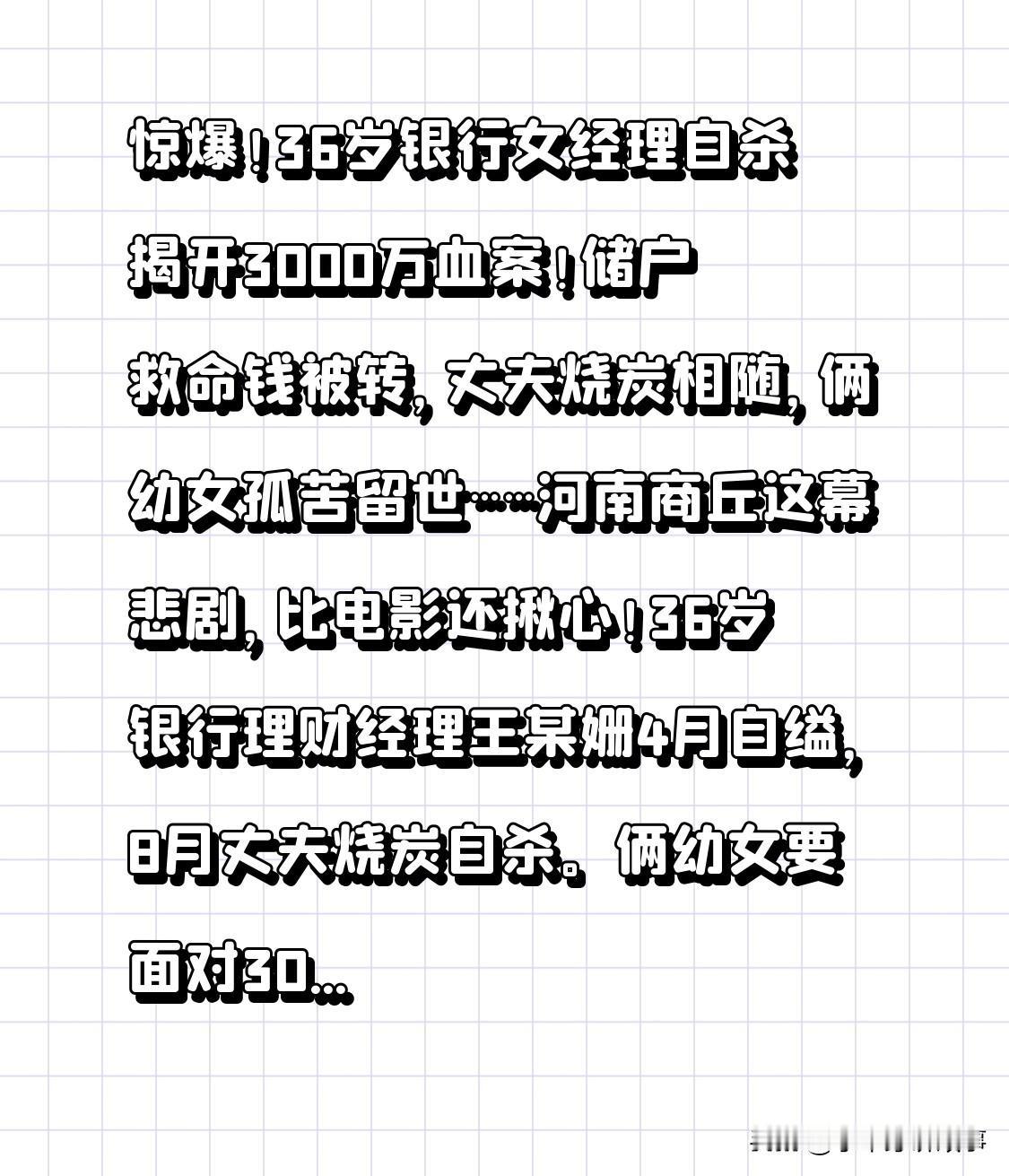 惊爆!36岁银行女经理自杀揭开3000万血案!储户救命钱被转,丈夫烧炭相随,俩幼女孤苦留世…… 河南商丘这幕悲剧,比电影还揪心!36岁银行理财经理王某姗4月自缢,8月丈夫烧炭自杀。俩幼女要面对3000万烂账,钱全是储户血汗。 72岁老人167万救命钱剩600多,脑梗离世;丽丽78万儿子结婚钱剩4519元,全家绝境。而王某姗自杀前订180万豪车,丈夫花20万买游戏装备。 嫌疑人已死,警方撤案,储户打官司,部分老人等不及。贪心毁人毁己,孩子背负债务成长…… 银行理财陷阱 储户权益