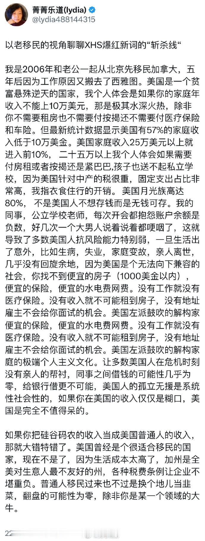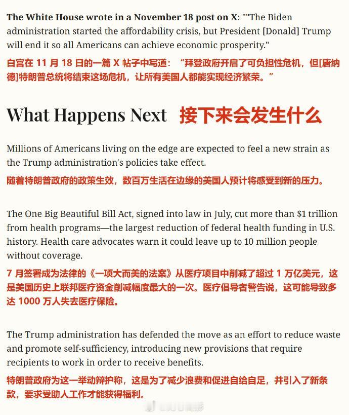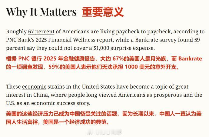 美国《新闻周刊》报道了“斩杀线”一词在中国的走红,并联系了美国国务院要求置评“斩杀线”。 文章一开头就引用数据,表示大约 67%的美国人是月光族,59%的美国人表示他们无法承担 1000 美元的意外开支。 此后报道称,中国网友在小红书、微博等平台围绕“45万美元年薪在旧金山也活得很艰难”的案例展开讨论,话题标签被称为“美国斩杀线”(他们翻译成“美国死亡线”)。 报道称,一位自称长期生活在西雅图的博主(它说的是图5,菁菁乐道那篇)在推特长文中说,美国家庭如果年收入不到10万美元,没有免租/免房贷、没有医疗保险,“生活会非常艰难”,多数美国人几乎没有缓冲,一旦失业、生病或离婚就迅速陷入危机。 另一位在网易撰文的财经作者强调,美国“有稳定住所是保住工作的重要前提”,失去工作和支付房租能力后,多数人很快会无家可归。 文章称,中国舆论场既有惊讶也有幸灾乐祸情绪,还指责官方关联媒体也在放大这些讨论(有吗?),将美式资本主义塑造成“混乱、残酷”,与中国国家主导的发展模式做对比。 然后文章一边挽尊,说“中国低保并非自动获得”,“中国的正式社会福利体系比美国弱得多”,一边表示,【中国非正式家庭支持(有家庭托举)和较低服务价格(医疗、教育等)形成了一种“缓冲层”,让体系没那么“脆”】 (这TM是想把政府在扶贫、社会保障方面做的各种“锁血”措施,归因为“家庭承受力更强”,也可以说这个作者根本不清楚中国的保障制度) 文章最后,开始批评特朗普的“大美丽法案”,称【随着特朗普政府的政策生效,数百万生活在边缘的美国人预计将感受到新的压力。】 这就搞笑了,仿佛美国的“斩杀线”是从特朗普时期才有的一样,归根结底,报道并不是想解决美国存在的“斩杀线”问题,还是为了党争。斩杀线
