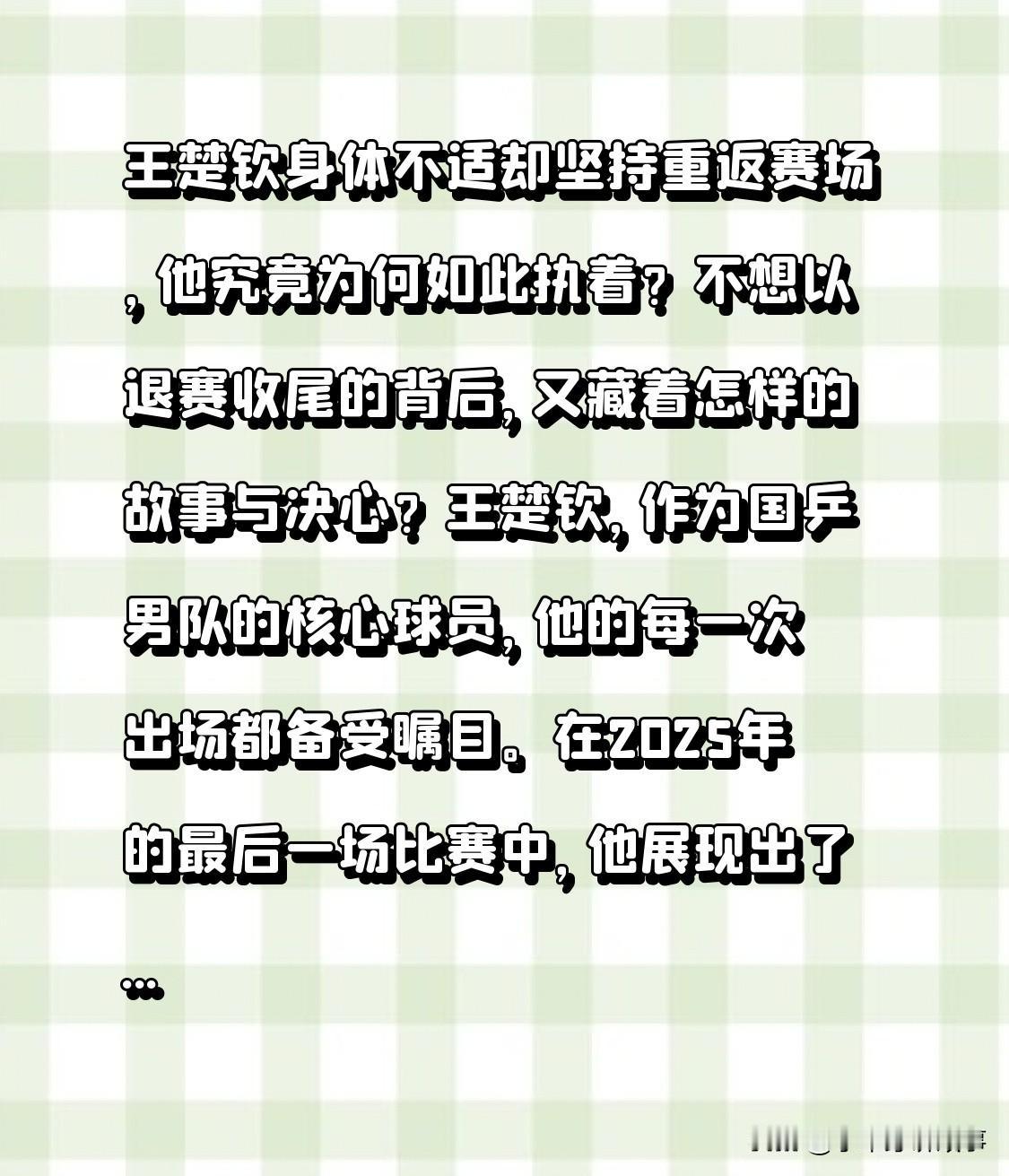 王楚钦身体不适仍坚持重返赛场,他为何如此执着?不想以退赛收尾,背后藏着怎样的故事与决心? 作为国乒男队核心,王楚钦每次出场皆备受关注。2025年最后一场比赛,他顽强拼搏。山东魏桥晋级决赛,他称不想两次退赛收官,虽身体未痊愈,仍上场,为不留憾、为团队梦。他与赵子豪是老对手,此次激发斗志。赛场上他状态佳,感染观众,展现对乒乓的热爱。他坚持,为个人荣誉,更为团队夺冠。 他的坚持给球队注入动力,让我们看到运动员的艰辛。你对他的决定有何看法?来评论区留言!