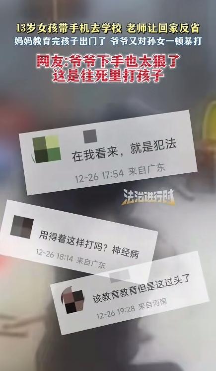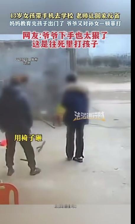 这种教育方式真的有问题!还用棍棒底下出孝子那一套来教育孩子!13岁女孩带手机去学校,老师让女孩回家反省。家长知道后,妈妈先是教育了一番,而后爷爷又对孙女一番暴打。网友:爷爷下手也太狠了这哪里是教育孩子。 河南,一位13岁的小姑娘,就因为带手机去学校,被老师叫回家反省。 妈妈知道后,刚把孩子说一顿出门,爷爷就对孙女下了狠手——扫帚直接打断了,还拎着椅子往孩子身上砸,用脚猛踢孩子,用手扇孩子耳光。监控里这画面看得人心里揪得慌。 网友看到后评论道:“这哪是教育啊,简直是往死里打”。 还有的网友说:“就算孩子真的犯错了,也不能这么动手啊!更何况对一个小姑娘下狠手,这对孩子的身心造成多大的伤害呀!” 隔着屏幕都能感觉到孩子精神上的恐惧和身体的疼痛,一把扫帚、一把椅子,都是家里再普通不过的东西,咋就成了打孩子的家伙? 爷爷心里估计是恨铁不成钢,觉得孩子违反校规就得往狠里管,可老话说“响鼓不用重锤敲”,这哪是管教,分明是没边没沿的暴力。 孩子带手机去学校确实不对,家长该教该管没错,但教育的根儿是“教”和“育”,不是靠拳头让孩子服软。 “棍棒底下出孝子”那老一套早就过时了,动手打孩子,只会让孩子心里又怕又恨,根本不会真明白自己错在哪,反而会在心里留下疙瘩,连祖孙之间的情分,也这么给砸没了,最后落个“亲者痛”的下场。 这事也正好戳中了隔代教育的老毛病。不少爷爷奶奶带娃,总抱着老一辈的老想法,觉得“打是亲骂是爱,不打不骂不成才”,却忘了现在教育最看重的是尊重和理解。 他们不懂孩子的心思,也不知道这种暴力管教,不光会弄伤孩子的身子,更会毁了孩子心里的安全感,甚至还犯法。 《未成年人保护法》早就明确规定:不能对小孩实施家庭暴力,就算是家里人,动手打孩子也不是“家务事”,是犯法的事儿。 依我看,“浇树要浇根,育人要育心”,真想教好孩子,从来都不是靠拳头压服的。 做家长的得清楚,教育从来不是比谁拳头硬。孩子犯了错,与其火冒三丈动手打人,不如先沉住气,好好跟孩子唠唠:问问她为啥要带手机去学校,是想跟同学联系,还是忍不住想玩游戏? 然后,再跟她掰扯掰扯校规的理儿,说说老玩手机的坏处。“话是开心锁”,好好说话才能解开孩子心里的疙瘩,让她打心底里认规则,比逼着她低头管用多了。 孩子长大是要慢慢引着走的,不是靠打压出来的。可别让那份自以为是的“爱”,变成扎向孩子的刀子。 针对此事,大家有什么看法呢?欢迎评论区讨论留言。