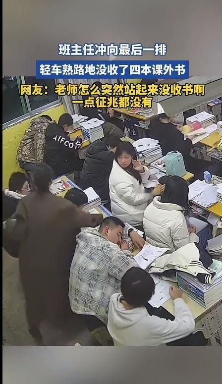 班主任正在讲课,意识到不对劲以后,突袭最后一排,轻车熟路地没收了四本课外书!网友笑喷:这熟练度刻进DNA里了! 12月26日江西,一段教室监控视频火得一塌糊涂:课堂上,班主任突然起身冲向后排,动作那叫一个行云流水,轻车熟路就没收了四本课外书,整个过程快得学生都没反应过来。 网友看了被逗笑了:“老师咋突然就站起来了,一点征兆都没有” 还有的网友说:“这熟练度,一看就是老班主任了,简直是‘姜还是老的辣’”。 视频里的画面,简直就是无数人上学时的真实写照。最后一排,仿佛永远是课堂上的“隐秘角落”,总有同学偷偷藏着课外书,趁老师转身写板书的功夫赶紧瞄上几眼。 而班主任,也总有一双“火眼金睛”,后排的小动作根本逃不过他的法眼,突袭的速度更是快到让人猝不及防。 这一幕,一下子戳中了网友的青春回忆,不少人笑着感慨:“原来全国的班主任,都练过同款‘后排突袭术’,真是‘天下老师是一家’啊。” 但笑着笑着,也有人品出了画面背后的温情。班主任这看似突然的“突袭”,可不是单纯的没收书本,更多是想维护课堂纪律,也是提醒学生别在课堂上走神。 上学那会儿,我们总觉得老师没收东西的举动有点“不近人情”,可长大之后才明白,那些看似严厉的瞬间,藏着的全是老师对学生的上心。 老师不是不想让你看课外书,而是怕课外书耽误了课堂学习,怕走神的功夫落下了知识点。就像这位班主任,熟练的动作背后,是无数次悄悄关注着学生的状态 “师傅领进门,修行靠个人”,老师能做的,就是不想让任何一个孩子在课堂上掉队。 当然,也有人聊起“课外书”的边界问题:不是所有课外书都该被禁止,好的课外读物能拓宽视野、丰富见识,关键是得分清场合。 “什么山头唱什么歌”,课堂是学课内知识的主阵地,课外书大可以留到课余时间读,这既是守课堂纪律,也是对老师教学的尊重。 而老师的“没收”,也不该只是简单的“一收了之”,要是课后能和学生聊聊,分一分课外书的类型,再引导学生合理安排阅读时间,“话是开心锁”,这样的教育,会更有温度。 这则视频之所以能引发这么多人共鸣,说到底,是因为它还原了最真实的校园日常,也唤醒了我们对师生关系的温暖记忆。 那些年被老师没收的课外书,那些猝不及防的“后排突袭”,如今想起来,都成了青春里又好笑又暖心的小片段,真应了那句“年少不懂老师意,读懂已是过来人”。 大家上学的时候,有没有被老师收走课外书呢?咱们评论区唠一唠吧!