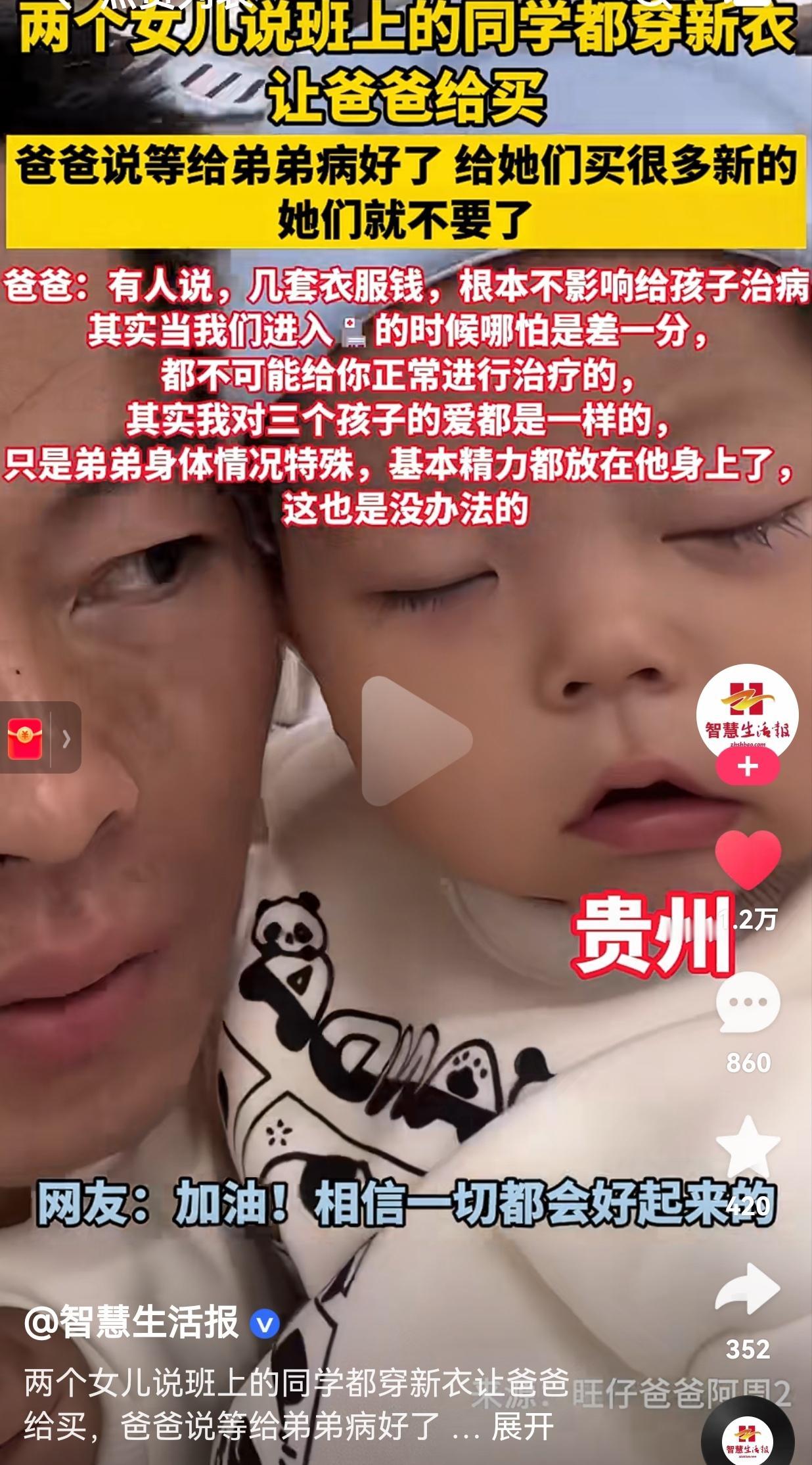 太懂事了!不过也挺心酸的,两个女儿说班上的同学都穿新衣了让爸爸买,爸爸为幼子治病圆不了女儿新衣梦,娃一句“不要了”让人看得人眼泪直流。 近日,贵州一男子在网上分享了一段视频,直接看哭了一大帮子人。 男子家里俩小姑娘,眼瞅着班上同学都穿新衣服了,自己还是旧衣,为了早日穿上新衣,于是两个孩子怯生生地跟爸爸念叨,说自己也想要一身新的。 爸爸红着眼眶蹲下来,摸着闺女的头说,等把弟弟的病治好,就给她们买好多好多新衣裳。没想到俩孩子听完,立马摇摇头,直接地蹦出一句“不要了”。 这位爸爸的难处,全搁在一句掏心窝的话里了。有人说,不就几套衣服嘛,能花几个钱,咋还能影响给孩子治病? 可男子的心里门儿清,给孩子治病这事儿,那就是一分钱憋倒英雄汉,差一丁点儿,都能耽误治疗。 他说,自己对三个娃的爱从来没偏过心,只是小儿子身体实在特殊,所有心思、所有力气,都不得不扑在弟弟身上。 这份手心手背都是肉的取舍,是当爹的最无奈的选择,真是家家有本难念的经啊。 这一幕,把普通家庭遇上坎儿的心酸和拉扯,全摊开了。 对孩子来说,一件新衣服就是天大的盼头,是能跟小伙伴显摆的小骄傲。可对这位爸爸来说,这却是在“女儿的小心愿”和“儿子的命”之间,必须咬着牙做的难抉择。 他不是不想满足闺女,实在是现实的大山压得他喘不过气——治病的钱是救命钱,每一分都得掰成两半花,这份沉甸甸的责任,压得他半点儿不敢松劲,这就是巧妇难为无米之炊的无奈啊。 而两个闺女那句轻飘飘的“不要了”,才真叫人鼻头一酸。孩子的世界多简单啊,想要新衣服再正常不过,可她们愣是从爸爸泛红的眼眶里、哽咽的语气里,读懂了难处。用最单纯的法子,体谅着爸爸的不容易。 这份远超年龄的懂事,像根细细的针,轻轻扎在每个当过爹妈、当过孩子的人的心尖上,难怪说穷人的孩子早当家。 网友看到后评论说:“这位爸爸也太不容易了”。 还有的人感慨:“孩子的懂事看得人想哭”。 还有人默默送祝福,盼着小弟弟能早点好起来。 其实啊,在咱们身边的普通家庭里,这样的瞬间一点儿都不少见:爸妈为了一家子的生计奔波忙活,孩子悄悄把自己的小愿望藏起来,一家人你疼我、我体谅你,咬着牙扛过一个又一个难关,这就是患难见真情,亲情的模样大抵就是这样。 生活这回事儿,从来不会一直顺风顺水,人生不如意事十之八九。可亲情里的这份互相理解、互相包容,总能成为扛过风雨的底气。 这位贵州爸爸的故事,让我们看见了困境里父爱的厚重,也看见了孩子纯粹的暖心。 愿这一家人拧成一股绳的爱,能让这个小家庭早点迎来曙光。愿生病的小弟弟早日康复,蹦蹦跳跳地跟姐姐们玩耍。也愿这两个懂事的小姑娘,最终能穿上那件心心念念的新衣服。 针对此事,你有什么看法呢? 信息来源:旺仔爸爸阿周2