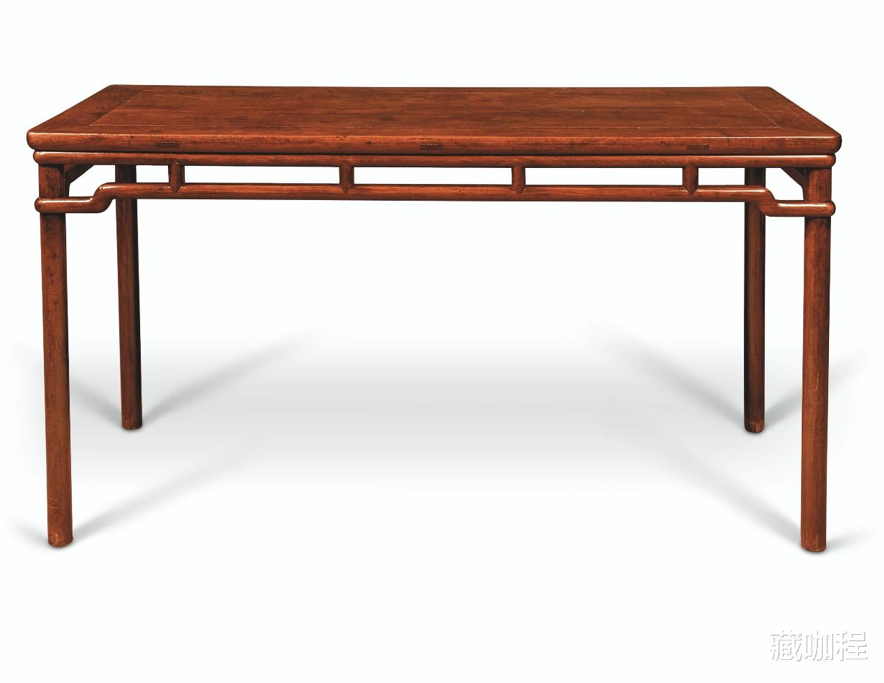 赫维宁汉庄园藏黄花梨裹腿罗锅枨画桌,长158.2宽73高87.6厘米,三维比前者均大一点,边抹立面乃冰盘沿而非素混面,面心板四角也不是圆弧形。