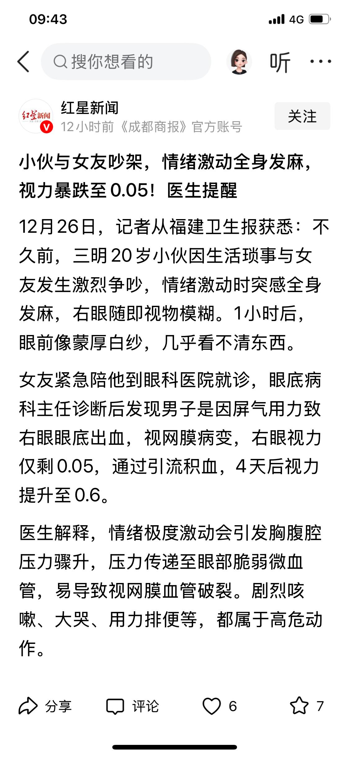 福建三明,一小伙和女友吵架时,全身突然发麻,右眼也看不清东西,仅过了1个小时,小伙就看不见东西了!女友急忙送他去医院检查,诊断为眼睛血管破裂引发的视网膜病变。网友:气得真不轻啊! 当时小伙子因为生活里一点鸡毛蒜皮的小事和女朋友吵了起来,两人越说越激动,就在吵得最凶的时候,他突然觉得浑身发麻,右边眼睛看东西也变得模模糊糊,好像隔了一层纱,短短一个小时,他右眼的视线就从模糊变成几乎一片漆黑,什么都看不清了。 女朋友见状也慌了神,赶紧陪他赶往眼科医院。经过医生详细检查,发现他是因为情绪激动时屏气用力,导致右眼眼底血管破裂出血,造成了视网膜病变,此时他的右眼视力只剩下0.05。 这种病在医学上被称为“视网膜病变”,当人情绪极度激动,或者剧烈咳嗽、用力排便时,胸腔和腹腔的压力会突然急剧升高。这股压力会顺着血管传递到眼睛里,视网膜上的毛细血管非常脆弱,承受不住这么大的压力就会破裂出血。血液渗漏到视网膜上,尤其是负责中心视力的黄斑区,视力就会严重受损。 经过及时的引流积血等治疗,四天后小伙子的视力恢复到了0.6。但这番经历着实把他和女友都吓得不轻。医生说,幸好他们就医及时,如果出血量更大或者拖延治疗,可能会对视力造成更长期的影响。 情绪管理真的不是小事,它直接关系到我们的身体健康。生活中难免会遇到让人上火的事,但学会控制情绪,避免过度激动,也是在保护自己。对于本身有高血压、糖尿病等基础疾病的人,情绪剧烈波动带来的风险可能更高,更需要特别注意。 希望这个小伙子的经历能让大家引以为戒。遇到争执时,先冷静三秒,深呼吸一下。毕竟,气坏了身子,受罪的还是自己。 各位读者你们怎么看?欢迎在评论区讨论。