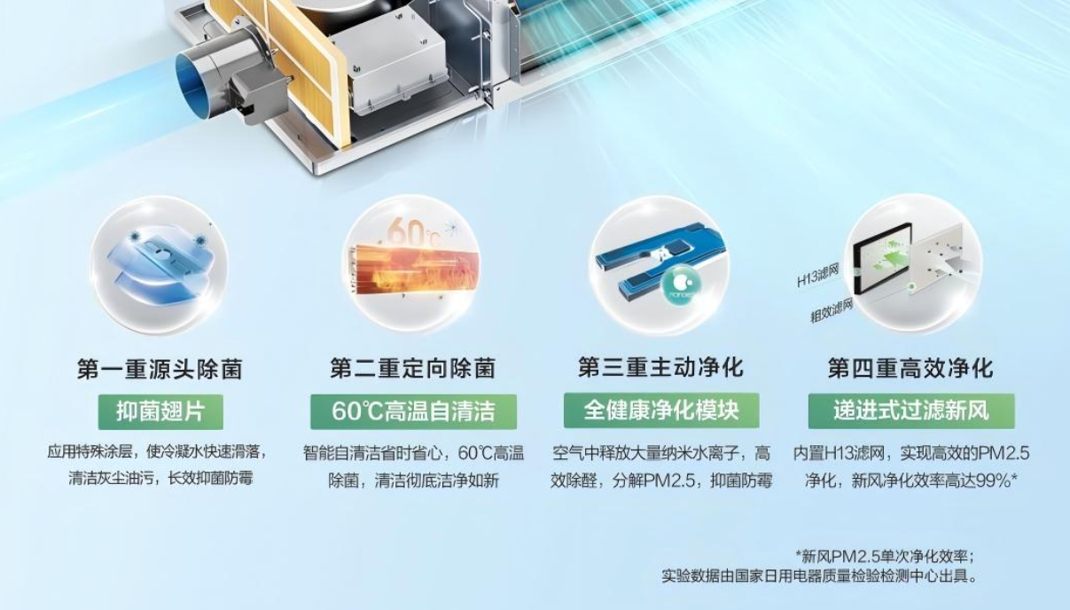 第二重 60℃高温自清洁定向除菌,为空调的内部清洁提供了有力保障。在空调使用一段时间后,内部容易积累细菌和污垢,而这一技术能够自动进行高温清洁,定向去除细菌,让空调始终保持良好的运行状态,也为用户提供了更加健康的空气环境。
