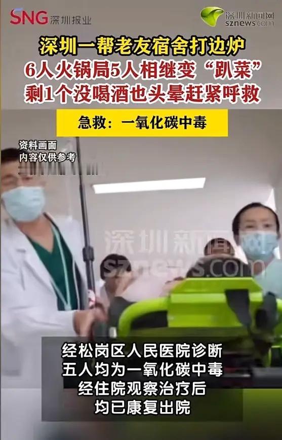 广东深圳,一男子与朋友聚餐,关闭门窗后将空调打开,随后开始吃火锅,结果朋友们陆续恶心呕吐,直接趴在桌子上,男子以为是他们是喝醉了,直到没有喝酒的他也开始头晕想吐,才意识到不对劲。医院:一氧化碳中毒! 晚上几个人聚在朋友租的公寓里,图个暖和热闹,门窗关得严严实实,空调也打开了。桌上摆着个炭烧铜火锅,炭火烧得正红,汤底咕嘟咕嘟冒着泡,谁也没觉得有什么不对。 吃着吃着先是有人觉得头晕、恶心,接着另一个朋友冲去卫生间吐了起来,回来就直接瘫在椅子上,大家还开玩笑,以为是酒量不行。可没过多久,没喝酒的人也开始天旋地转,胸口发闷。 最后那个还算清醒的朋友,自己也感到剧烈的头痛和浑身无力,才猛然惊醒到不对劲,他强撑着用最后一点力气打开门窗,然后拨通了急救电话。 送到医院诊断结果是一氧化碳中毒,在密闭房间里烧炭,炭火不完全燃烧就会产生大量无色无味的一氧化碳。空调内循环不仅没换气,反而让这些毒气在屋里均匀扩散。人体吸入后,氧气输送被阻断,就会头晕乏力,严重时会昏迷甚至致命。 很多人觉得开空调,室内是“安全”环境,却完全忽略了燃烧需要消耗氧气并产生废气这个基本常识。无论是炭火锅、燃气热水器,还是围炉煮茶,只要是在不通风的空间里明火燃烧,都是一颗定时炸弹。 这次聚餐的几个人算是幸运的,因为发现和送医还算及时,经过高压氧舱等治疗,陆续康复了。 温暖和热闹当然重要,但没有什么比安全更重要。冬天取暖聚餐,务必保持通风,生命需要流动的空气。窗开一条缝,不是为了冷风,是为了活命。 各位读者你们怎么看?欢迎在评论区讨论。