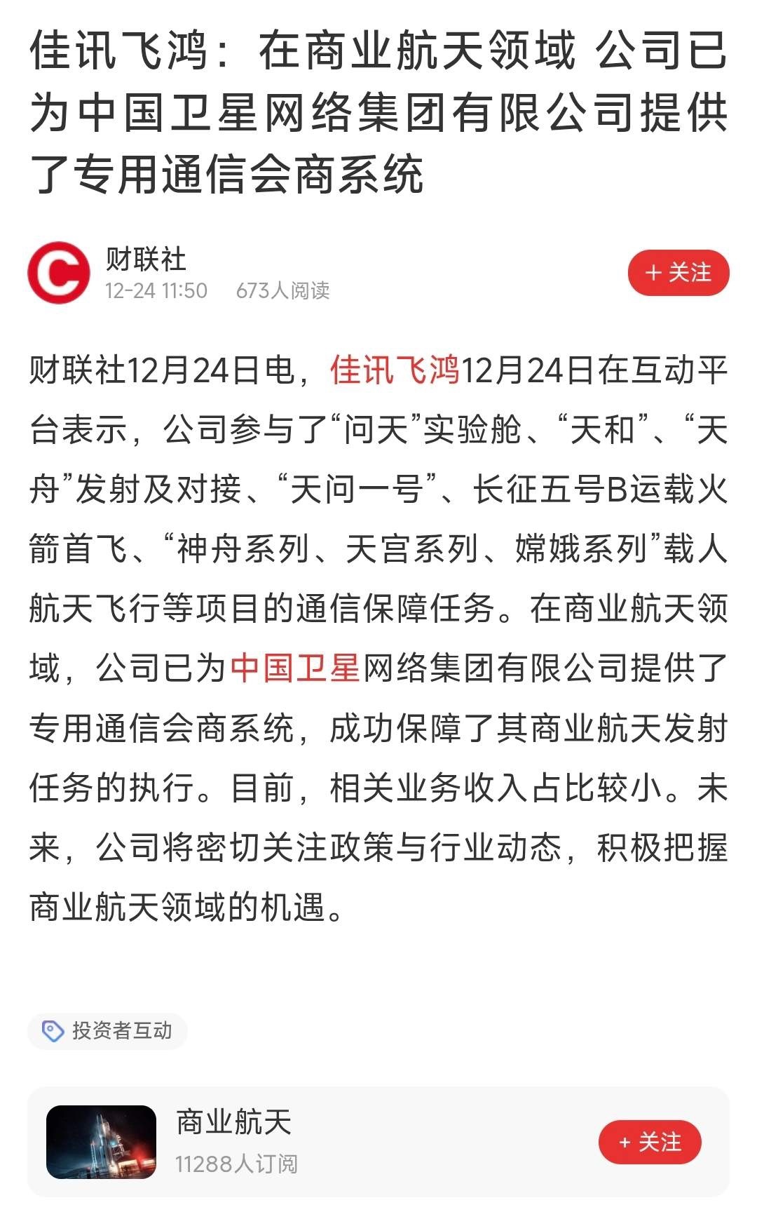商业航天大利好,可以在亏损的情况下发行新股上市了!佳讯飞鸿,商业航天板块底部票,上涨趋势已经形成!就要跟随板块起飞了。公司参与了“问天”实验舱、“天和”、“天舟”发射及对接、“天问一号”、长征五号B运载火箭首飞、“神舟系列、天宫系列、嫦娥系列”载人航天飞行等项目的通信保障任务。还不止上面这些,妥妥的深入参与其中。日线走势也不错