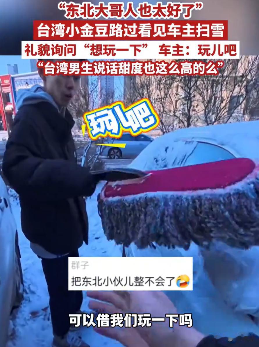 笑不活了!黑龙江哈尔滨,一男在早上在路边擦车扫雪,本来干的不开心,结果突然一名男生走过来,礼貌询问自己能不能“玩一下”,一句话直接把男子都给弄懵了,后来才知道,对方是台湾过来的,没见过这种扫雪,觉得很有趣。网友:扫雪来我家院子玩,给你一把扫帚 在哈尔滨的冬天,扫雪这事儿对本地人来说,早就成了刻进DNA里的麻烦活,可谁能想到,有一天这冻手冻脚的苦差事,会被当成新鲜玩具抢着体验?最近哈尔滨街头的一幕,直接把南北地域差异的可爱之处拉满了。 事情发生在一个清晨的哈尔滨街头,零下二十多度的低温里,寒风像小刀子似的刮在脸上。一位本地大哥正闷头给停在路边的车扫雪、除冰,厚厚的积雪覆盖了整个车顶和车窗,手里的拖布划过玻璃,发出“咔嚓咔嚓”的脆响,每动一下都要耗费不少力气。 早起的困倦加上扫雪的繁琐,让大哥的脸色不太好看,干起活来也是一脸不情愿,完全没注意到身后有个身影正好奇地盯着他。 就在大哥弯腰清理车轮旁积雪的时候,身后的年轻人慢慢凑了上来,犹豫了几秒后,小心翼翼地发出了请求。 这个请求直接让大哥愣在原地,手里的拖布都停在了半空中,整个人懵了好一会儿才反应过来。原来年轻人问的是能不能借他“玩一下”扫雪的工具,体验一把扫雪的感觉。 大哥这辈子扫雪无数,见过借火、问路的,还是头一回遇到有人主动要“玩”扫雪的,心里满是疑惑,不知道这冻人的活儿有啥好玩的。 但看着年轻人礼貌又期待的样子,他还是把手里的拖布递了过去。接过拖布的年轻人瞬间眼睛亮了起来,学着大哥的样子开始尝试推雪,一开始动作还不太熟练,用力过猛溅了自己一脸雪沫,非但没生气,反而笑得格外开心。 大哥在一旁看着,越看越觉得有意思,原本的烦躁情绪也渐渐消散了。跟年轻人闲聊了几句才知道,对方是从台湾来哈尔滨游玩的,这是他第一次见到真实的大雪,更别说亲手扫雪了。 在他眼里,漫天飞舞的雪花和扫雪时积雪被推开的样子都格外新奇,完全不觉得这是辛苦的体力活,反而像发现了新玩具一样兴奋。 年轻人拿着拖布认真地清理着车旁的积雪,一会儿推成小堆,一会儿又用脚踩实,每一个动作都充满了新鲜感,嘴里还时不时发出惊喜的感叹。 大哥则站在一旁笑着围观,偶尔提醒他注意脚下别滑倒,原本冷清的街头,因为这一幕变得格外温馨。路过的行人看到这有趣的场景,也忍不住拿出手机拍了下来,把这段跨越海峡的冬日小插曲分享到了网上。 视频一经发布就迅速引发了网友的热议,评论区里全是欢乐的调侃。东北网友纷纷表示感同身受,吐槽扫雪是冬天最头疼的事儿,没想到在台湾朋友眼里成了新鲜体验,直言“我扫雪扫得骂骂咧咧,他却玩得不亦乐乎”。 还有不少东北网友热情邀约,“来我家院子玩,给你一把扫帚,让你扫个够”“我家楼下积雪厚,管够体验”。 南方网友则纷纷表示羡慕,留言说“同为南方人,我也想体验一把扫雪的快乐”“看到他玩雪的样子,仿佛看到了第一次见雪的自己”。 还有台湾网友分享了自己的感受,说一直只在电视里见过雪,看到这一幕也忍不住想飞到哈尔滨,亲身感受一下扫雪的乐趣。 其实最近的哈尔滨正值冰雪旅游旺季,松花江冰雪嘉年华刚试开园不久,各种特色冰雪项目吸引了大批游客前来打卡。 对北方人来说习以为常的冰雪景象,对很多南方和台湾的游客而言,都是值得探索的新奇体验。就像这场意外的扫雪体验一样,地域差异带来的不仅是趣味反差,更让陌生人之间多了一份温暖的连接。 对此,你们有什么看法,欢迎评论留言~