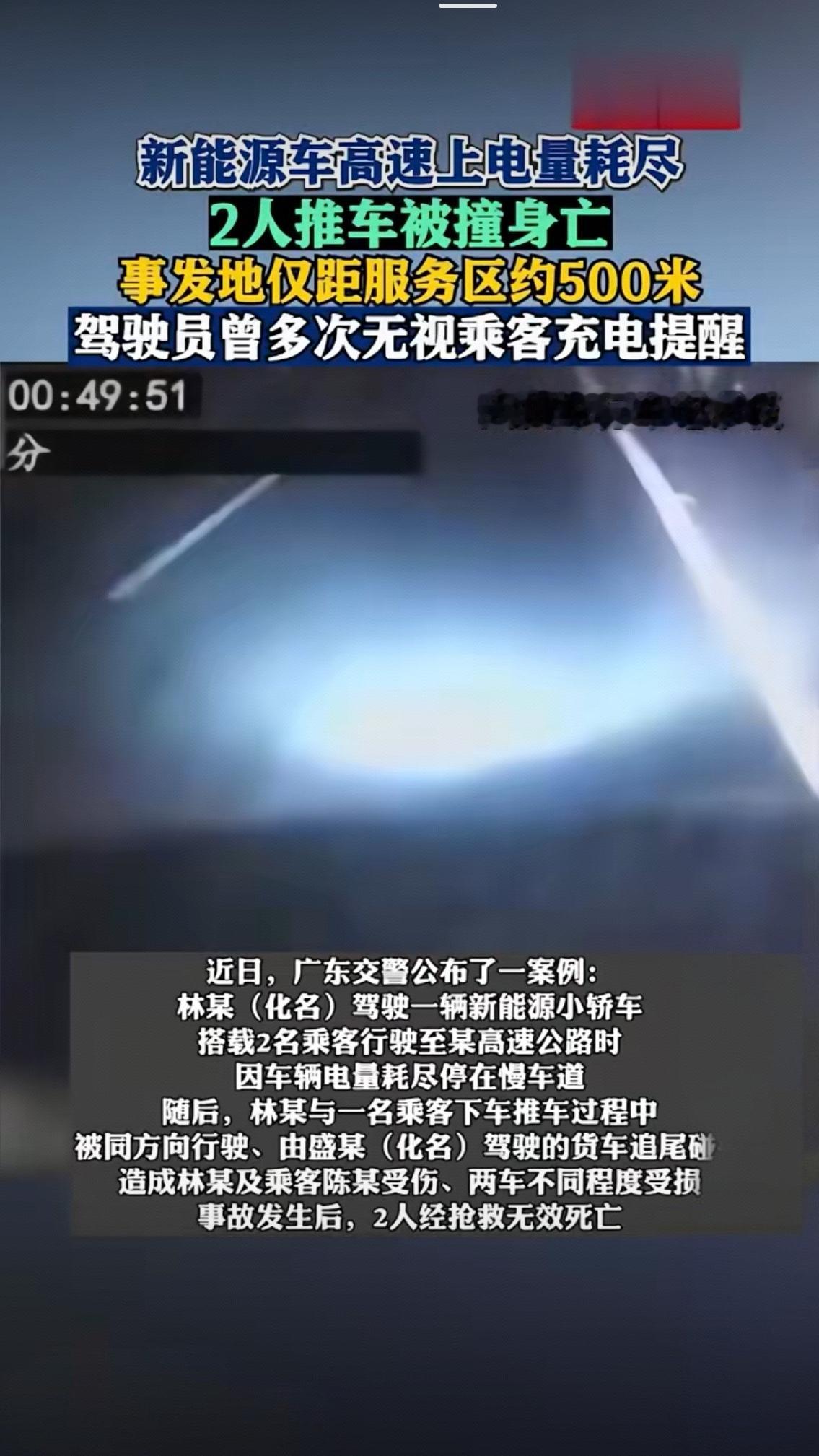 500米!两条人命!新能源车高速趴窝,这些教训比黄金还贵 500米,不过是成年人几分钟的步行距离,却成了两条生命无法跨越的生死线。广东这起新能源车高速事故,看得人脊背发凉——明明再坚持几百米就是服务区,明明乘客多次苦口婆心提醒充电,却因为驾驶员的侥幸与固执,最终酿成车毁人亡的惨剧。 谁能想到,这场悲剧的源头,竟是一次次被无视的安全预警。出发前,驾驶员就明知车辆电量仅够行驶80公里,乘客当即提议充电后再出发,可他摆摆手觉得“没必要”;高速上经过第一个服务区,乘客盯着续航表再次提醒,他踩着电门说“还能撑”;第二个服务区擦肩而过时,同行人几乎是恳求着让他补能,他依旧抱着“再开一段就到”的侥幸,把警告当成耳旁风。 直到车辆在距离第三个服务区500米处彻底“罢工”,停在川流不息的慢车道上,这位驾驶员依旧没意识到危险。他没有开启双闪,没有在车后150米设置警示标志,更没有让人员撤离到护栏外,反而拉着一名乘客下车推车,想用“人力”完成最后500米的冲刺。可高速上的车流不会给侥幸留时间,大货车的视线盲区里,20米的推行距离,成了生命的终点。 交警最终认定,驾驶员承担主要责任——他不仅违法在行车道停车、推车,更无视《道路交通安全法》中“高速故障需立即报警救援”的铁律。这场悲剧从来不是新能源车的“续航原罪”,而是人对规则的漠视、对生命的轻慢。多少人开车时总抱着“偶尔一次没关系”的心态:超速一点点、酒驾一小口、故障了随便处置一下,却忘了高速路上,任何一个微小的疏忽,都可能引发致命后果。 更让人痛心的是,这起事故本有三次挽回的机会:出发前的充电建议、两次服务区的补能窗口,只要驾驶员抓住其中一个,悲剧就不会发生。可他偏偏把乘客的善意提醒当负担,把交通法规当摆设,最终用两条人命为自己的固执买单。 “车靠边、人撤离、即报警”,这九字真言早该刻进每个驾驶员的骨子里。高速上车辆故障,无论燃油车还是新能源车,首要原则都是“保人不保车”。推车、修车、在车道内逗留,这些行为都等同于把自己推向死神。而对于同行乘客来说,遇到驾驶员执意冒险,学会坚决说“不”,甚至选择在安全地点下车,也是对自己生命的负责。 500米的距离,是警示也是警钟。生命没有侥幸,规则不容试探。愿这起悲剧能唤醒所有交通参与者:敬畏规则,就是敬畏生命;每一次谨慎驾驶,都是对自己和他人最好的保护。你是否也有过高速出行的惊险经历?