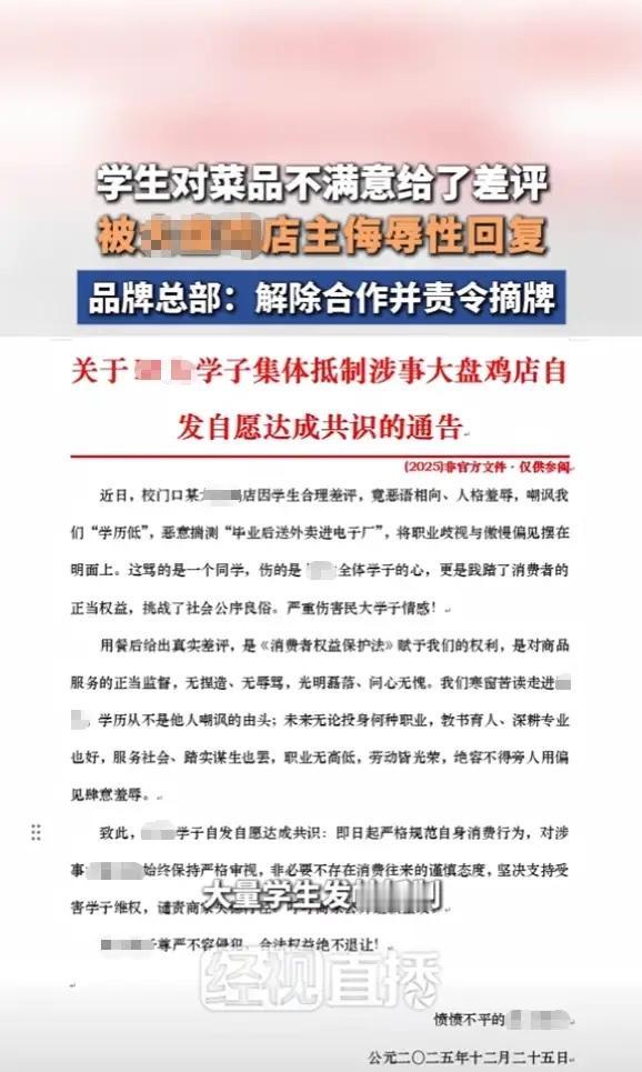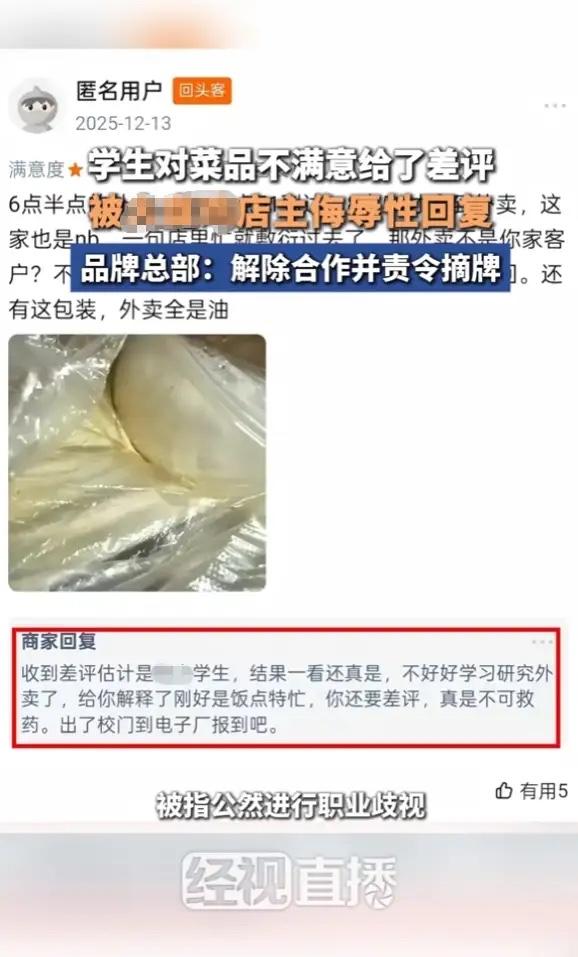 “玩不起别玩!”12月26日,甘肃兰州,一学生点了份外卖,因为商家超时,所以给了个差评,没想到商家看见之后,立马嘲讽学生学历低,还恶意诅咒,结果被品牌方看见后,直接解除与商家的合作关系。网友:格局太小了吧! 这事儿发生在兰州某大学门口的一家大盘鸡加盟店,学生小张满怀期待地点了一份17元的大盘鸡外卖,本来预计7点51分送达,结果左等右等,直到8点50分才拿到。打开一看,饭菜不仅凉透了,包装袋上还沾满了油渍,鸡肉分量也少得可怜。 小张实在气不过,就在平台上写了段评价,提到“17块钱到手5块儿鸡肉,骨头占一半,土豆就三块,跟店里吃剩的送来一样”。这本是消费者再正常不过的反馈,却点燃了商家的怒火。 店家不仅没有道歉,反而嘲讽小张“不好好学习研究外卖”,甚至恶意揣测其“出了校门到电子厂报到吧”“将来进社会迷茫了送外卖吧”。这些充满职业歧视的言论,深深刺痛了以学生为主体的消费群体。 相关截图在朋友圈、校园社群和社交媒体上疯传,学生们发起了抵制行动。商家一边赚着学生的钱,一边却鄙视学生的未来,这种“吃饭砸锅”的行为令人无法接受。许多网友也指出,送外卖、进电子厂都是靠劳动挣钱的正当职业,丝毫不丢人。 舆论发酵后,品牌总部迅速介入,曾要求涉事店主公开道歉,但遭到拒绝。鉴于该店行为严重损害品牌形象且拒不悔改,总部果断决定解除加盟合作,责令其摘牌停业。然而,涉事店主后续竟在沟通群内辱骂品牌方负责人,态度依然强硬。 据品牌方负责人透露,该店铺还存在另一位股东,需要协商后续事宜。但总部已明确要求在一周内撤下所有相关招牌,目前该店铺的外卖平台均已关闭。当地公安、食药监等部门也已关注并到场协调此事。 差评本是商家审视自身、改进服务的宝贵机会,理性应对甚至能化危机为转机,恶语相向不仅解决不了问题,反而会激化矛盾,最终付出惨痛代价。 各位读者你们怎么看?欢迎在评论区讨论。