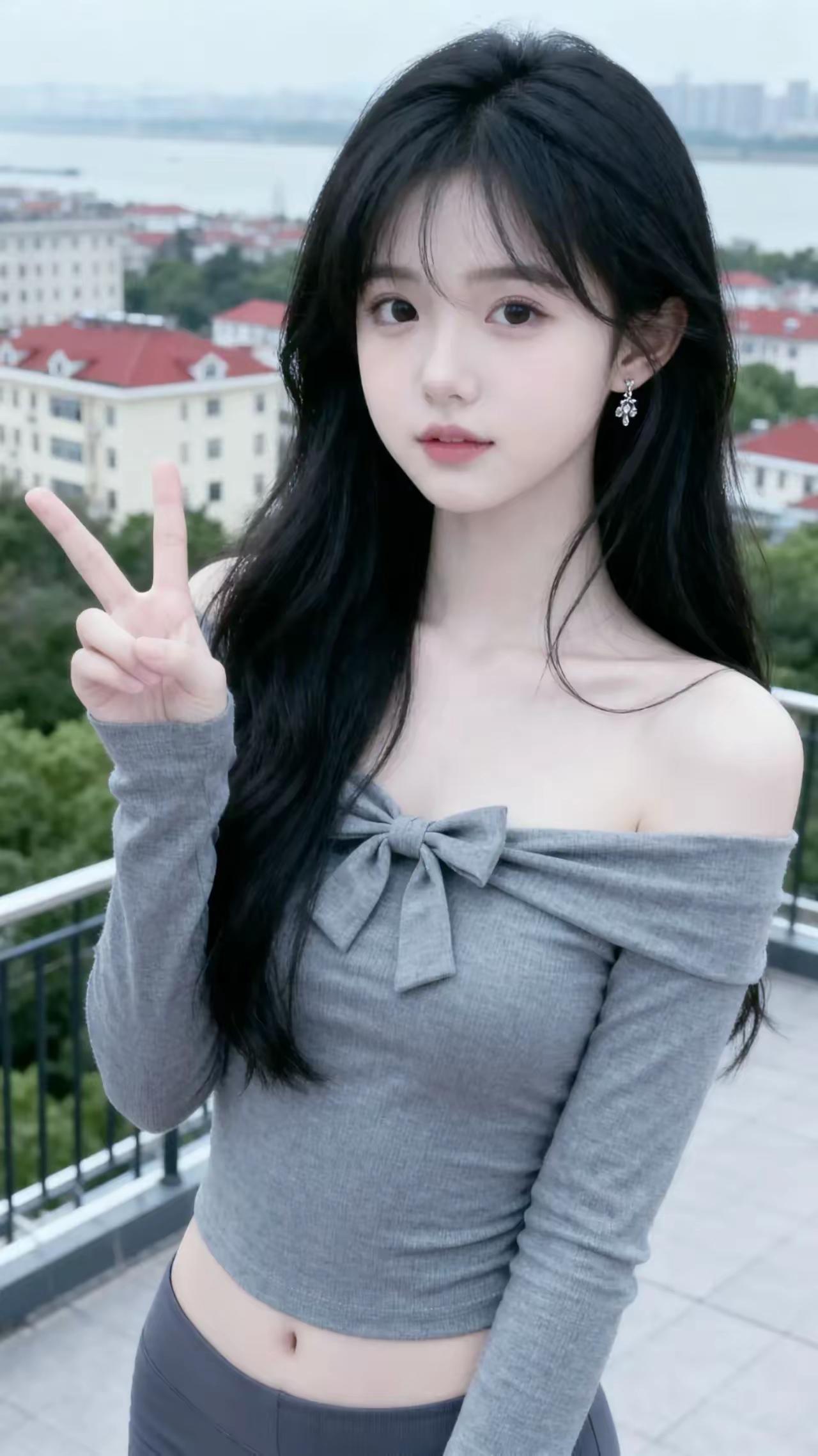 都市少女风,灰色露肩上衣搭配黑色长发,城市天际线背景,时尚又优雅。怎样赞美穿一身