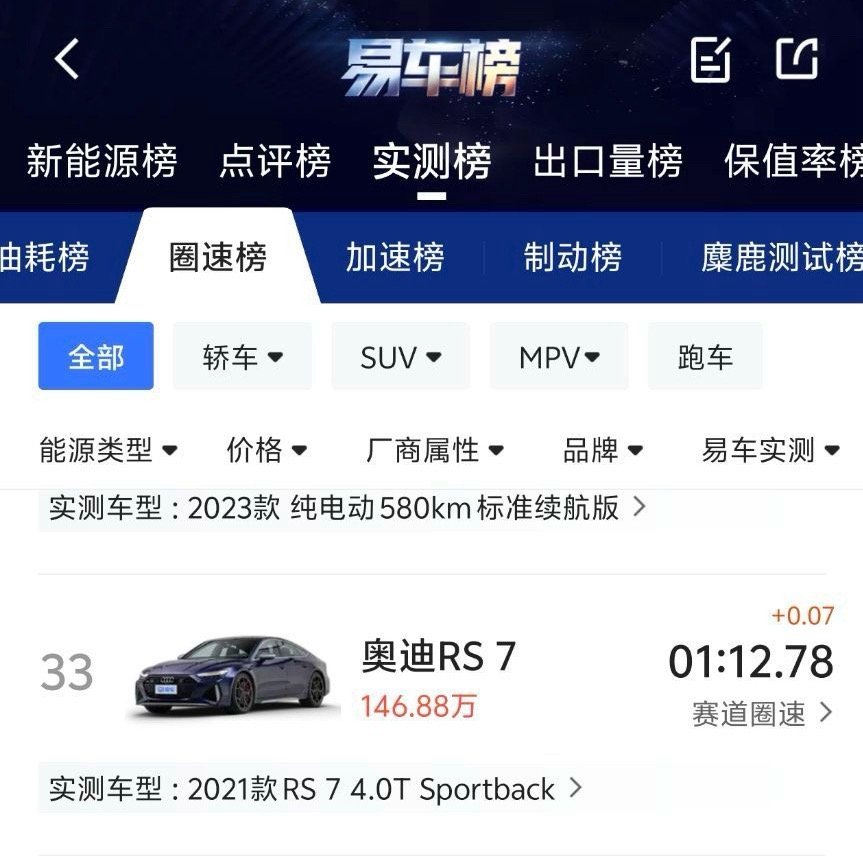 你是说这个整备质量3.15吨的玩意儿在易车金港能比RS7只慢.3???