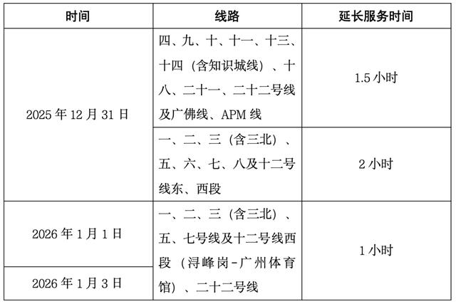 2026年元旦节当天(1月1日)及假期最后一天(1月3日),一、二、三(含三北)、五、七号线及十二号线西段(浔峰岗-广州体育馆)、二十二号线将延长服务1小时。