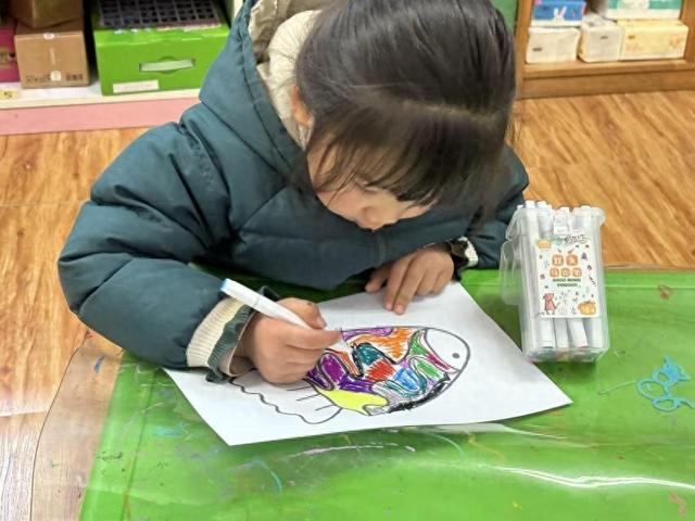 有的孩子画出五彩斑斓的锦鲤,有的添上灵动的水波与水草,有的为小鱼画上俏皮的笑脸,一笔一画都饱含童真童趣。孩子们专注涂色、认真创作,在色彩的世界里尽情挥洒创意,一张张洁白的画纸,在孩子们的笔下变得鲜活亮丽,一条条形态各异的小鱼跃然纸上,充满了喜庆的新年气息。