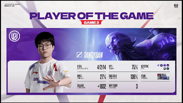 Tangyuan使用瑞兹打出4/2/14战绩,斩获LGD对阵AL第二局MVP