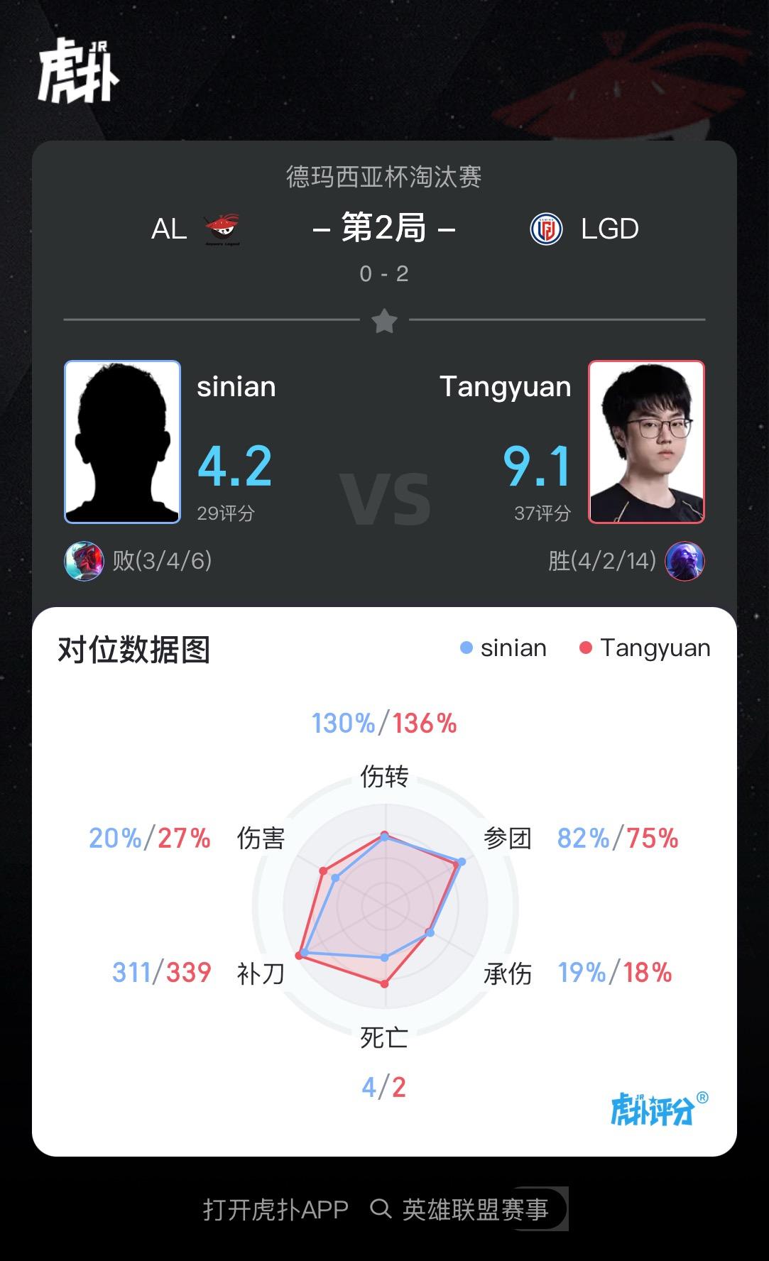 虎扑12月29日讯在刚刚结束的LGD对阵AL的对局中,Tangyuan使用瑞兹打出4/2/14战绩,斩获LGD对阵AL第二局MVP