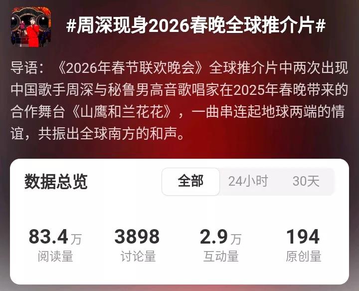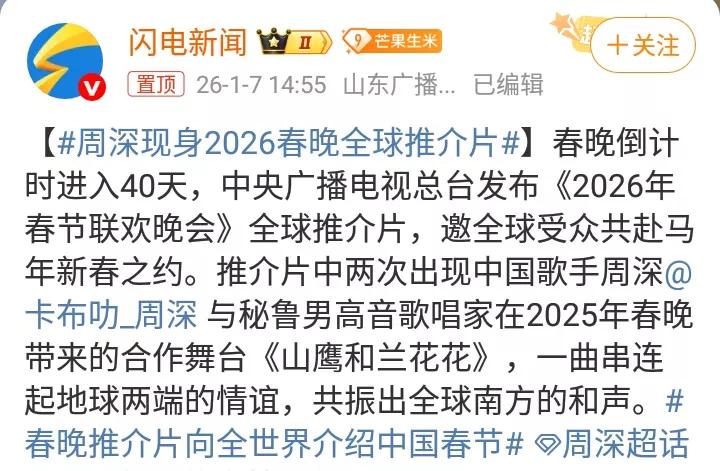 所以,网友们看到“周深现身2026春晚全球推介片”消息,也就进行了大量的讨论与互动!