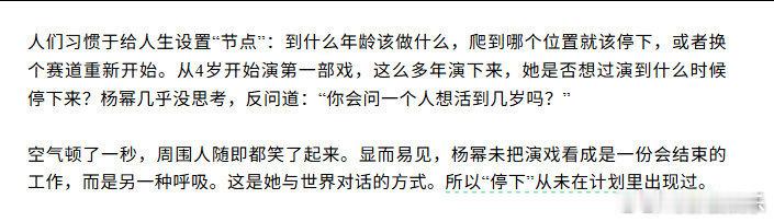 杨幂回应转型之年杨幂回应演到什么时候停下来 近日,受访时回应“2025是杨幂的转型之年”,杨幂说:“演员无法决定播出顺序”,“接二连三只是巧合”。被问是否想过演到什么时候停下来,她几乎没思考,反问道:“你会问一个人想活到几岁吗?”