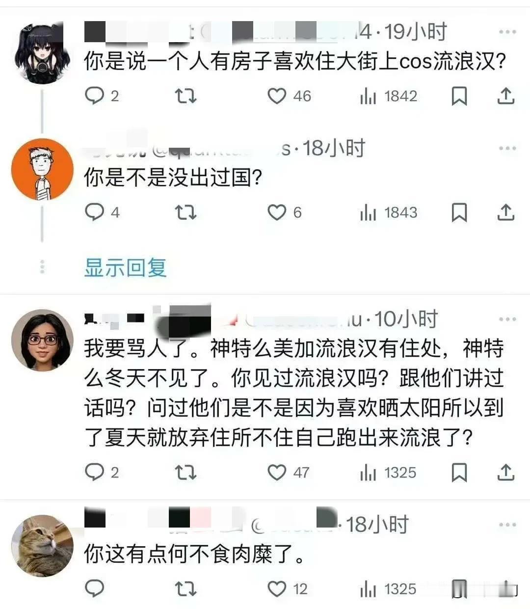 为了给美国斩杀线辩护,说美加流浪汉大部分都有住所,冬天就不见了,夏天再出来晒太阳,连海外华人都看不下去了,直言这是何不食肉糜,为了晒太阳,出来流浪,冬天再回去家里住,这种逻辑都能讲得出来,原来精美可以让人变得如此离谱,如此厚颜无耻,真的让人见识到了,这些精美们其实说到底就是双标,国内有点什么事情,就贬低,就说制度有问题,而国外无论发生什么事情,都是个例,满大街的流浪汉,你说个例,还强行辩护,所以对这些根本就不需要讲什么道理,打击就完了!