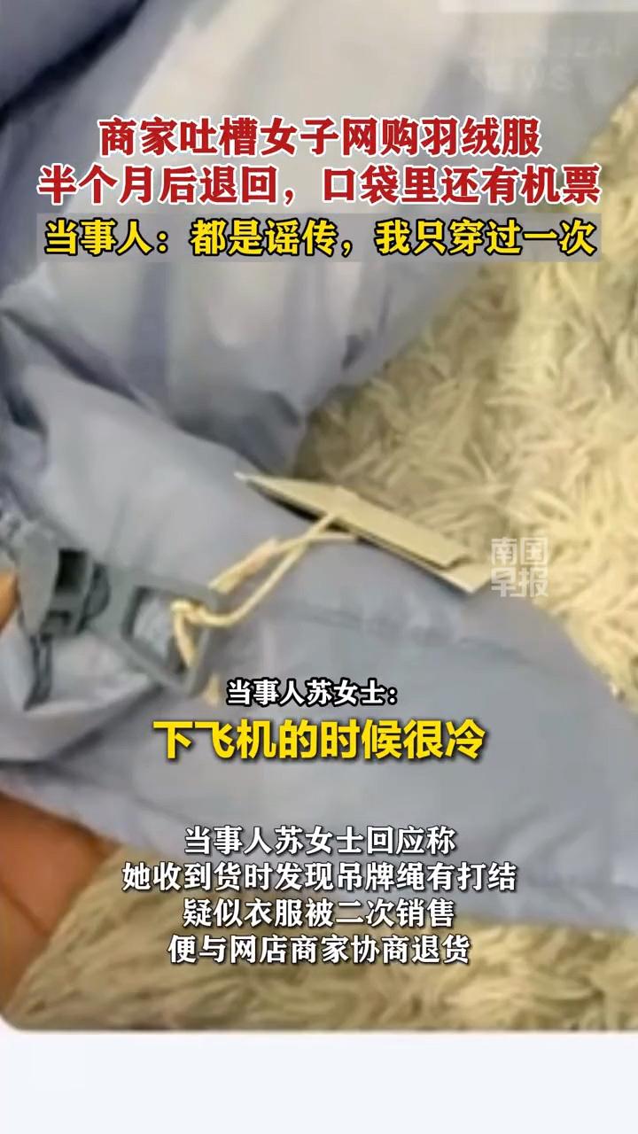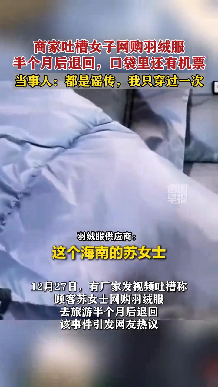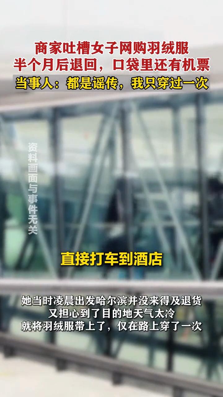 反转了!疑似白嫖羽绒服的女子回应了!她说羽绒服她就从机场穿到了酒店。油污不是她弄上的。 近日,一则白嫖羽绒服的视频引发了热议。一位商家称,收到一名顾客的退货要求,但是收到退回来的羽绒服以后,她吃了一惊。 原来,羽绒服上不仅有大面积油污,而且口袋里还有一张机票,显示是从三亚飞到哈尔滨的。 商家认为女子是白嫖羽绒服,穿着去哈尔滨旅游,然后回来后就退货。 目前,买羽绒服的顾客出来进行了回应,称自己并没有白嫖,她收到羽绒服的时候,就发现吊牌打结了,当时就怀疑是二次销售。 而她因为比较冷,所以就从机场到酒店这段时间穿了羽绒服。她说这件事曝光后,她的生活也受到了影响。 而商家称,目前羽绒服已经由生产厂家回收,双方已经达成一致,此事到此结束。 不过,我有两点疑问。第一,女子既然买了羽绒服,如果一开始就不喜欢,为啥要穿着去哈尔滨呢,而且让人疑惑的是,她还不剪掉吊牌。 第二,她说只是从机场穿到了酒店,那这个过程起码也得有几十分钟个把小时吧,这不是还是穿了吗? 但是呢,厂家的处理呢,又让人疑惑,如果厂家没问题,那为啥要回收羽绒服呢? 所以,究竟是不是白嫖,确实不好说!
