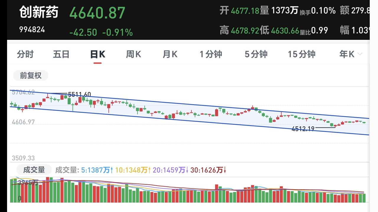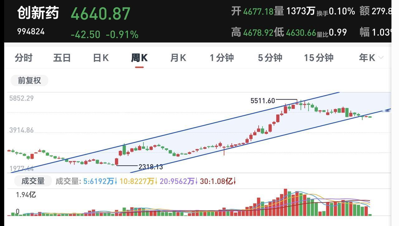 基金:等不了了,创新药前几个月赚的快亏没了,只能先把创新药都换了,又和以前的医药一样。 这是一位朋友的留言,谢谢这位朋友。 我认为: 1:不管什么板块,都会有三个阶段,高位回落阶段,低位震荡阶段,波段上涨阶段。 2:创新药板块是上半年上涨比较好的板块之一,现在处于高位回落阶段,会不会有低位震荡不知道,但大概率是会有的,低位震荡阶段是最受煎熬的,但这也是为将来享受利润在做准备,你受不了底部震荡的煎熬,你怎么可能享受上涨带来的利润。 3:很多人想象的玩基金是这样的,听某人说哪只基金好,随即梭哈进场,进场第二天就大幅度上涨,在最高点的那一天,有人告诉他后面会下跌了,随即全部离场,离场第二天就大幅度下跌,这只是做梦,这样的梦,一般人都都不敢这样做。 创新药板块基金,我持有的是富国,持有128117元,持有收益16948元,持有收益率15.25%,累计收益118864元,每天定投10块钱,从数据中可以看出,这只基金我真正的本金只有10000块钱,其他的都是利润在里面飞,见下面的截图2。 我们来看一下下面的截图3,这是创新药板块基金富国近一年以来的走势图,从图中可以看出,我进行了两次止盈,虽然不是最高点,但从现在的角度看,是在相对高位区域,我现在完全可以随时随地捞回止盈的筹码。 我们来看一下下面的截图4,这是创新药板块日K线图,从图中可以看出,我画了两条倾斜向下的斜线,这是创新药板块日线级别下跌通道,现在的位置处于这个下跌通道中,也就是说,创新药板块日线级别处于下跌趋势中。 我们来看一下下面的截图5,这是创新药板块周K线图,从图中可以看出,我画了两条倾斜向上的斜线,这是创新药板块周线级别上涨通道,前段时间跌破了这个上涨通道的下轨,本周是跌破上涨通道下轨的第三周,如果最后的两天不能收回到上涨通道内,就会是有效破位。 我迟迟没有捞回这个板块筹码的原因,主要是周线级别上涨趋势有可能会有效破位,另外一个原因是大盘走势并不是很稳当,这样的情况之下,还是需要继续观察。 最接近捞回筹码的时机,应该是回落到周线级别上涨通道下轨附近的那一周,那个时候主要是考虑日线级别还是处于下跌趋势中,后面如果能够上涨,突破日线级别下跌通道的上轨,我还是有可能会考虑捞回止盈筹码的。 我每天都会分享我的观点,我的观点只代表我个人的看法,不能作为你操作的依据,据此操作后果自负。