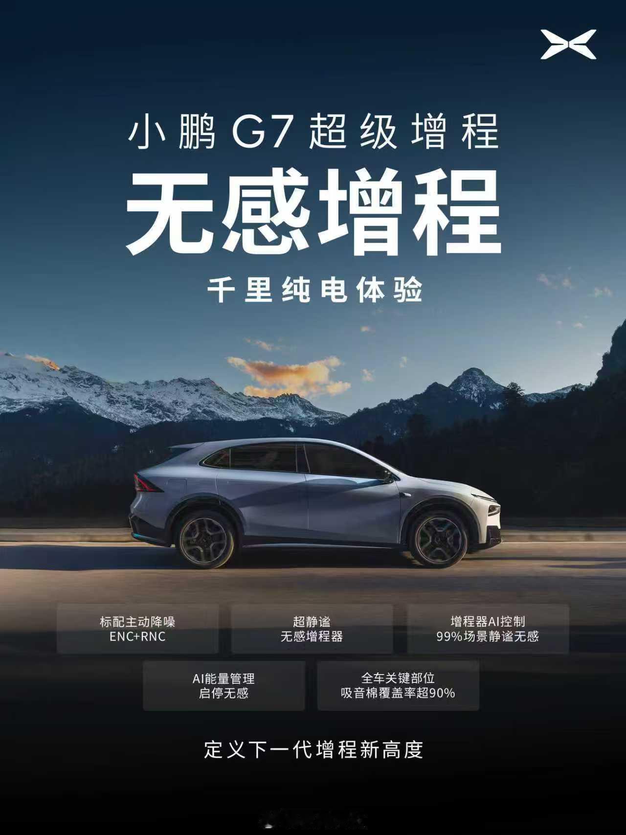 续航焦虑?不存在的!小鹏鲲鹏超级增程家族首款SUV小鹏G7重磅登场,直接刷新续航天花板,1704公里综合续航堪称“长途王者”!430公里纯电续航轻松覆盖城市通勤,春节自驾回家、跨城远行再也不用频繁找桩。1704公里超长续航SUV小鹏G7来了800V+5C超充AI电池buff拉满,12分钟就能补能314km;55.8kWh大电池+60L大油箱,妥妥自带“超级充电站”。ENC+RNC双主动降噪加持,搭配2250TOPS极致算力与超大空间,让每一次出行,都是舒适与科技的双重享受!小鹏G7超级增程