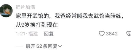 家里开武馆的,我爸经常喊我去武馆当陪练,从9岁挨打到现在