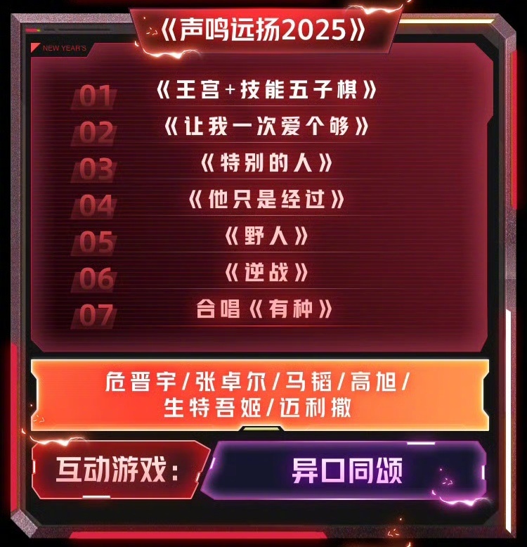 #声鸣远扬六强海口跨年首秀# 跟随节目单先睹为快,见证《声鸣远扬》六强选手在湖南跨晚外场的精彩演绎。不同风格的交汇,即将点燃海口的夜晚,共同期待这场声音的盛宴。#声鸣远扬六强湖南跨晚外场节目单#
