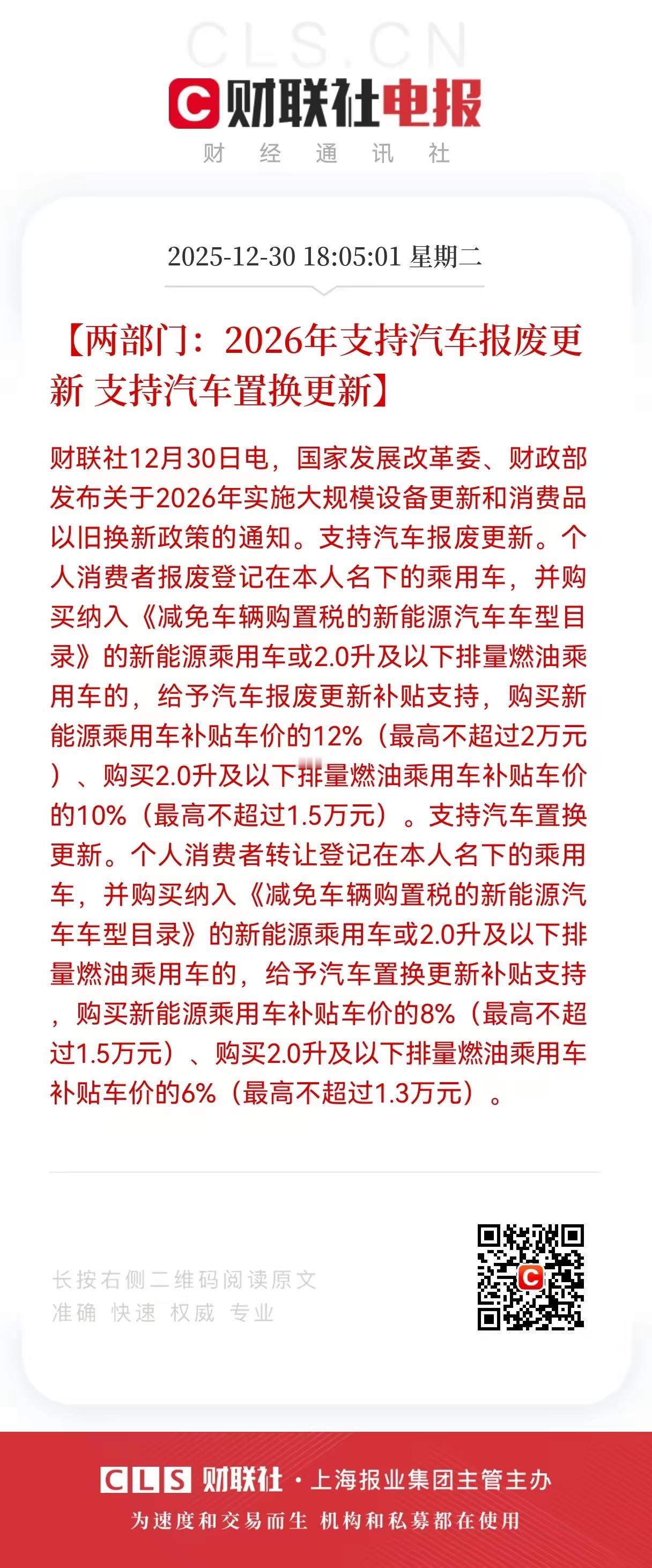 明年汽车板块上涨,直接利好新能源汽车,两部门:2026年支持汽车报废更新,支持汽车置换更新,2026年的国补政策,支持新能源汽车报废更新!优先考虑电动汽车!现在买汽车,旧汽车报废的,给予补贴支持,但最高不超过20000块钱,这种补贴还算比较高的! 明年很多旧的车基本上就要报废,直接购买新能源汽车!随着中国新能源汽车加速的发展,尤其是智能汽车的快速发展,后续换车潮还有大的空间!智能驾驶自动驾驶技术时代的到来,还有很大的换车空间!至少现在自动驾驶技术开始落地进行商用,那明年应该会陆陆续续的就有车可以进行销售上路了!