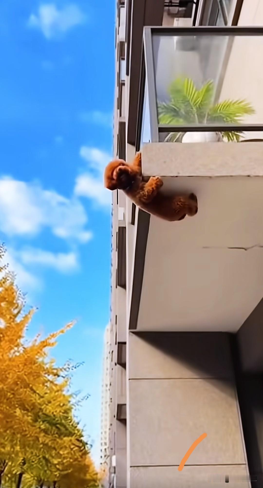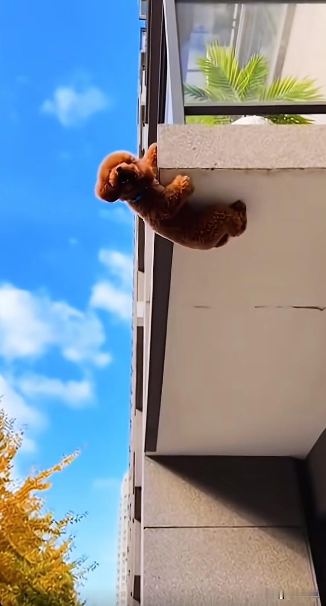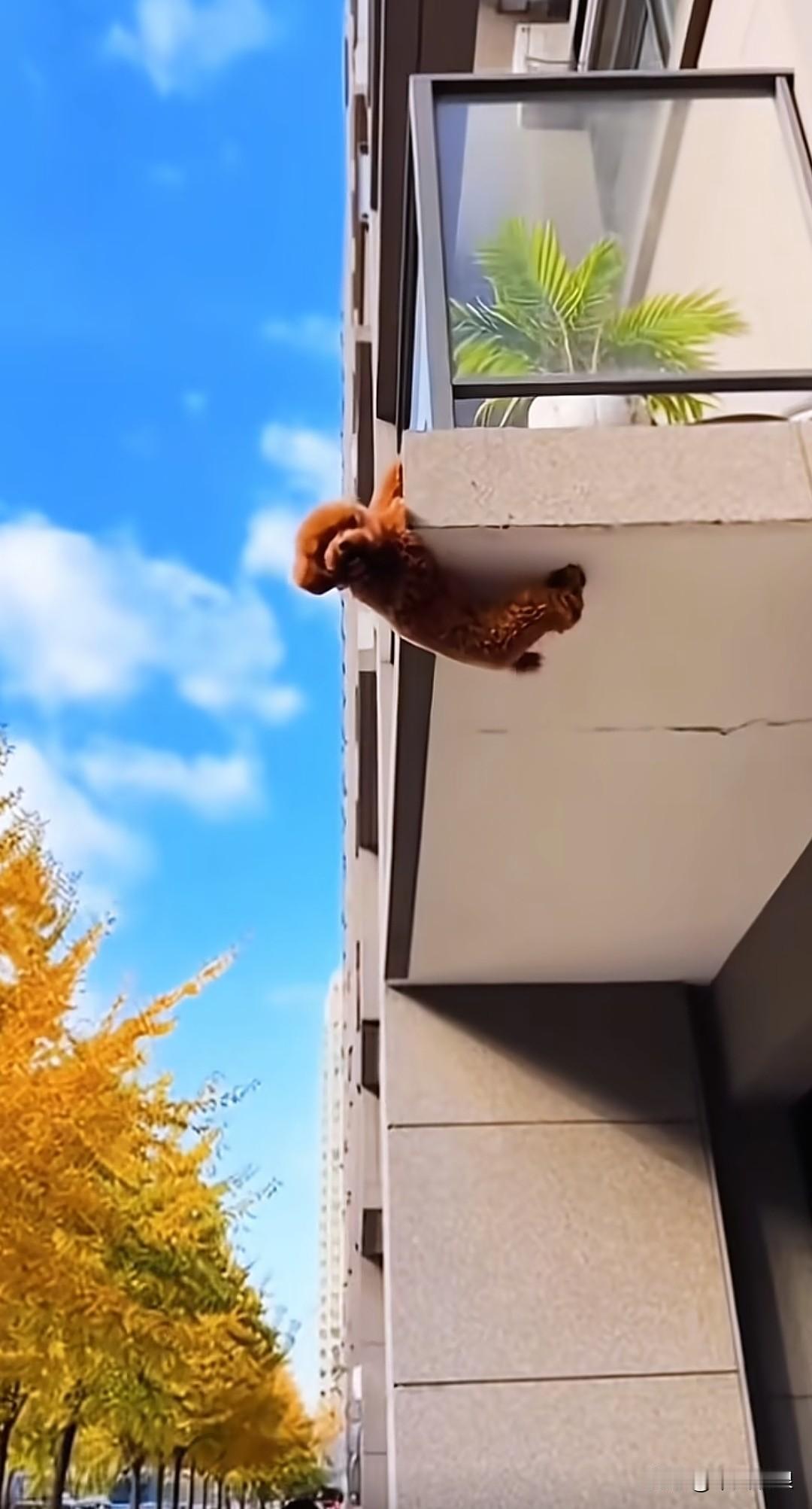 不知谁家的狗狗被关在了家里,它从高层凉亭钻出,险些掉落。好在狗狗用一只脚勾住了凉