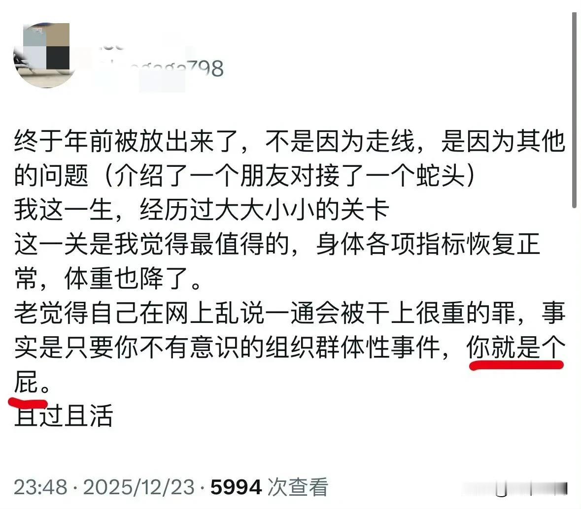 连沙滩的都分民主沙滩和非民主沙滩的润人,原来已经回国了,不过搞偷渡进去了,然后这几天放出来了,它感叹了进去这段时间最值得的是身体各项指标恢复正常了,体重也降了,反而比在美国当润人健康很多,证明了在国内坐牢都比去美国当润人要好很多,而且它还总结了以前以为自己在网上很有影响力,其实什么都不是,且过且活! 其实这就是土殖典型的心理,总以为它们在网上影响力很大,很多人很在意它们说的话,其实啥也不是,很多人只是把它们当做电子宠物而已!