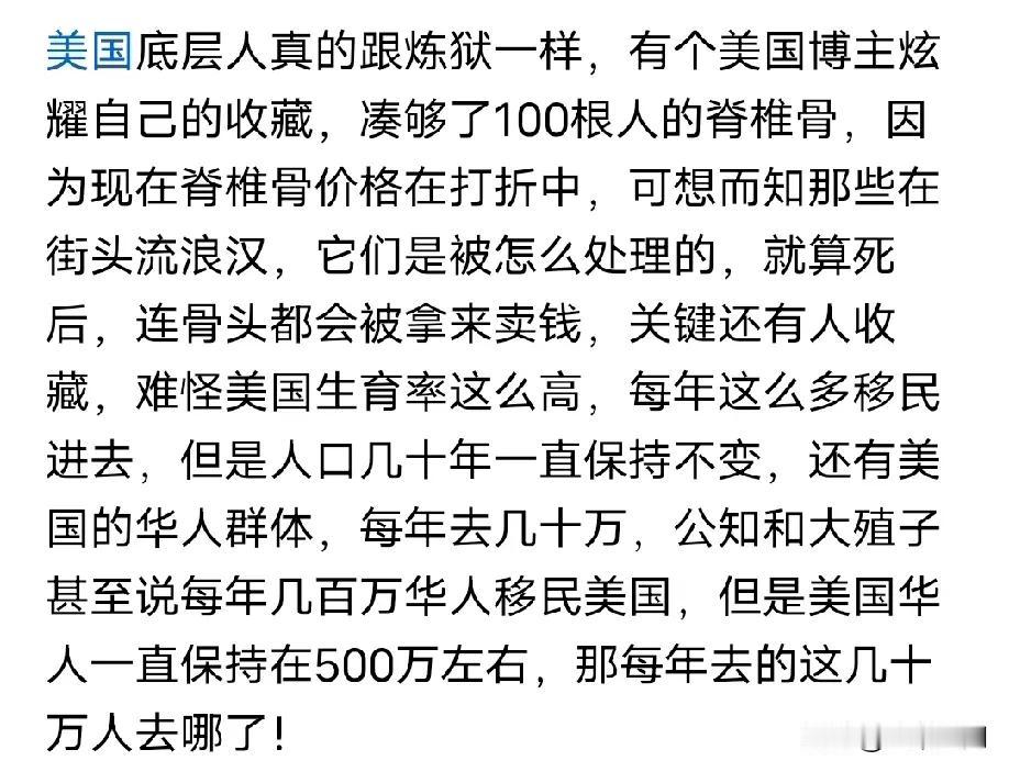 美国流浪汉如果不是瘾君子,那他活着就是商品,因为零件都干净,功能齐全,所以变成失踪人口,会提前被拉去拆零件卖了,如果是瘾君子,富人不要瘾君子的零件,所以活着根本就没人管它们,但只要死了,就变成商品了,所以街头只要有瘾君子冻死,立马被拉走了,连脊椎骨都可以买卖,而且合法,所以那个中国留学生博主不就是跟他的医学导师讨到一份法医的兼职,才知道斩杀线的吗?就是这么来的!所以美国真的是一个把丛林法则执行到底的国家!一个白左和斩杀线同时存在的国家,真的太不可思议了!