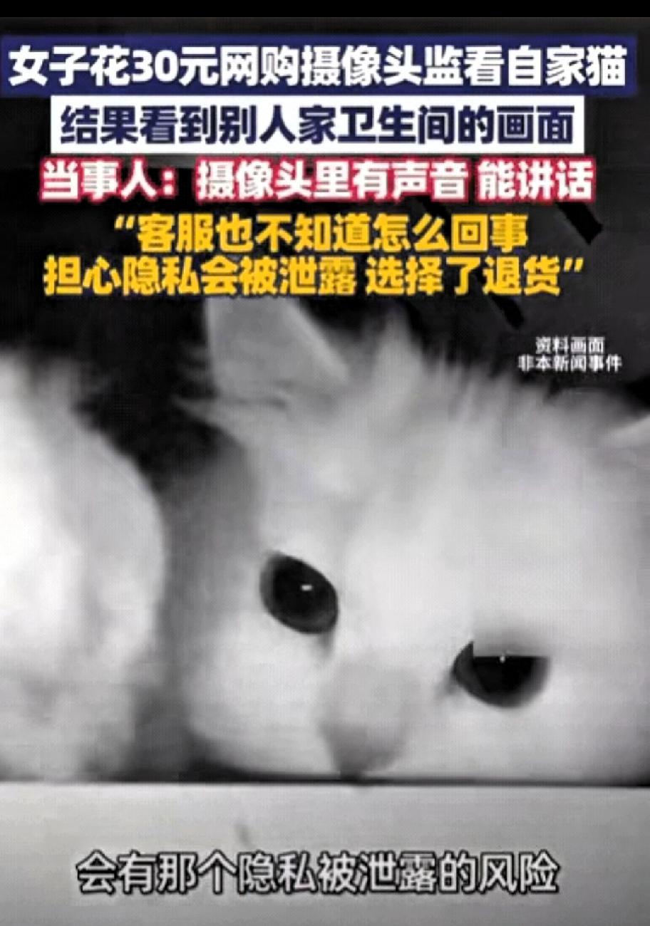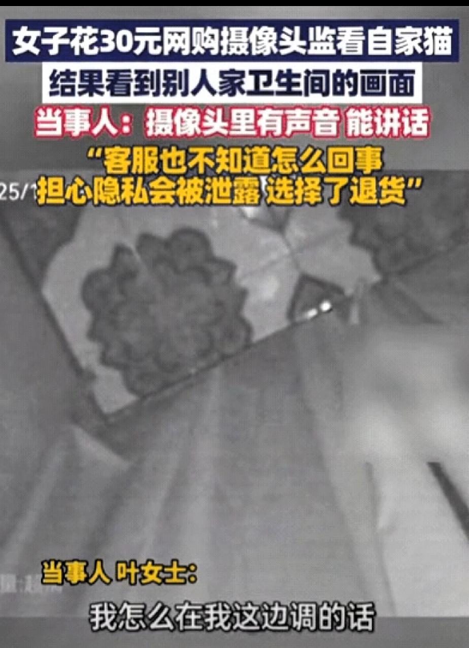 还能解释清楚吗? 广州一女子为了看自家猫,特意花30元在网上买了个监控,结果,她一打开监控,看到的竟然不是自己家,而是别人家卫生间,摄像头还能喊话,把她吓得不轻,她急忙问客服咋回事?可客服也不清楚,这种监控女子可不敢要,直接退了货!这种东西,千万别只图便宜。哪怕多花几十块,买正规厂家的产品,至少能查着资质,出了问题也有地方找。 自己能看别人家隐私,到时被人发现可就解释不清了!