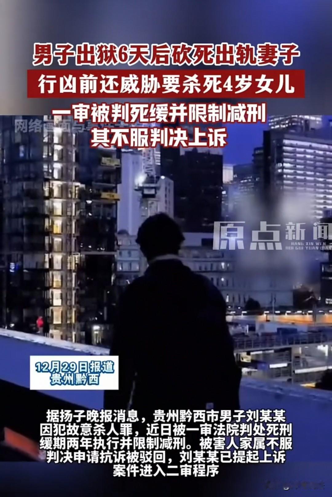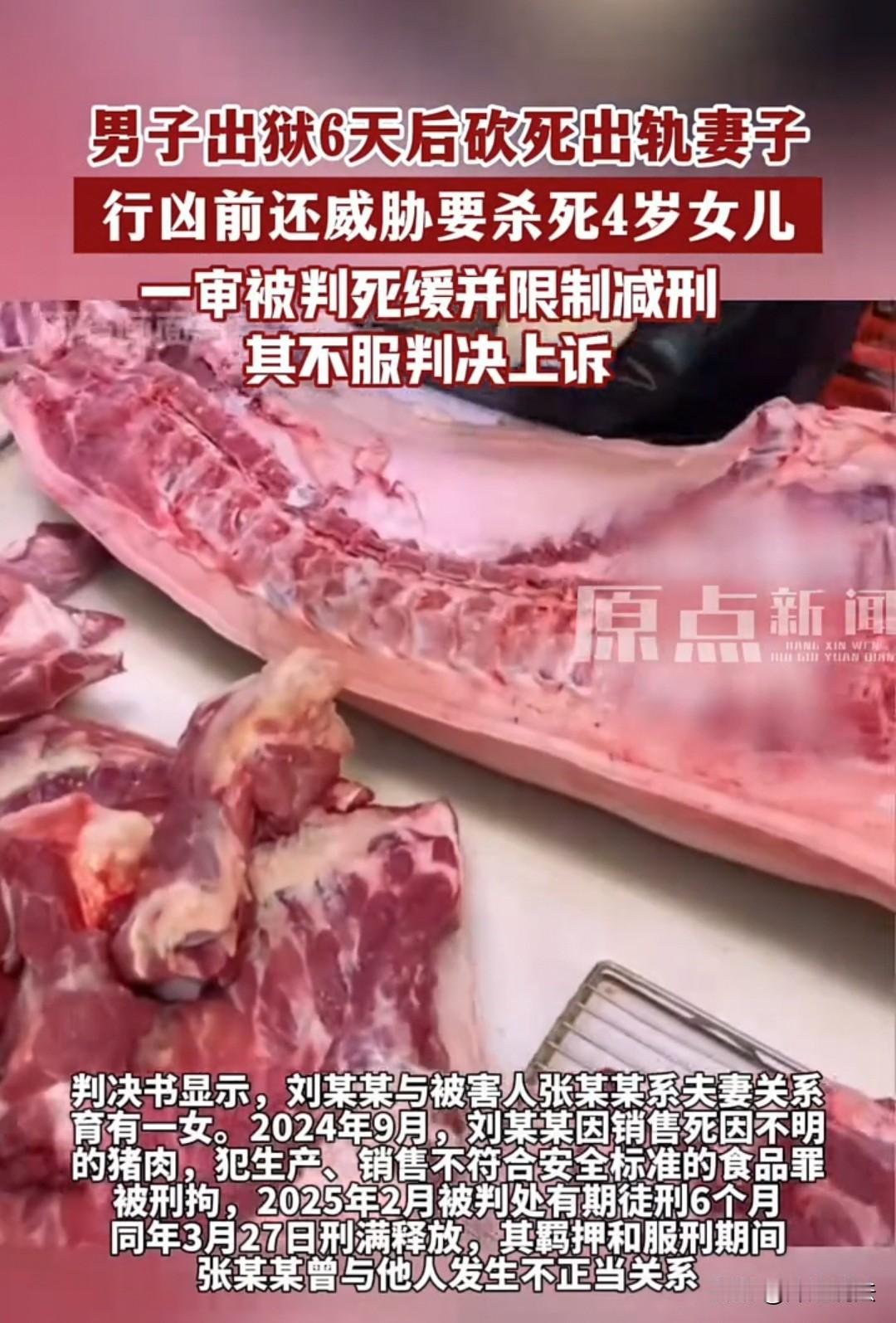贵州黔西,男子此前因售卖问题猪肉涉嫌违法犯罪,被依法判处刑罚入狱服刑。本以为妻子会守着家庭等自己归来,可让他万万没想到的是,在自己服刑改造的这段时间里,妻子竟耐不住寂寞,与他人有不正当的关系。男子出狱仅六天,积压的愤怒彻底爆发,更让人不寒而栗的是,在杀妻之前,男子竟曾产生过杀害年仅四岁亲生女儿的可怕想法。网友:一场背叛,两条命,家破人亡的结局早已注定! 男子刘某某此前因售卖问题猪肉涉嫌违法犯罪,2024年9月,他因销售死因不明的猪肉,犯生产、销售不符合安全标准的食品罪被刑拘; 2025年2月被法院判处有期徒刑6个月,由于刑事拘留的时间可折抵刑期,刘某某在2025年3月27日便刑满释放。 入狱前,他与妻子张某某约定好,等自己刑满释放后,两人痛改前非好好过日子,一起照顾年幼的女儿。 可让他万万没想到的是,在羁押和服刑改造的这段时间里,妻子张某某竟耐不住寂寞,背叛了婚姻,与他人有了不正当的关系。 刘某某的心里,原本还装着对家庭的最后一丝期待,想着出狱后能和妻子重新开始,给女儿一个完整的家。 可出轨的消息,彻底击碎了他的希望。 对他来说,服刑的日子本就难熬,妻子的背叛更是雪上加霜,比牢狱之苦更让他日夜煎熬。 他满心的悔恨和对未来的憧憬,渐渐被刻骨的仇恨所取代,复仇的念头开始在心底疯狂滋生。 为了能早点出狱,早点找妻子讨个说法,刘某某在狱中拼命改造,只盼着刑满释放的那一天。 这份执念,支撑着他从入狱一直熬到刑满释放。走出监 狱的那一刻,他没有丝毫重获自由的喜悦,满脑子都是妻子出轨的画面,以及自己曾经售卖问题猪肉入 狱的屈辱。 谁也没有想到,这场悲剧会发生在2025年4月2日上午,彼时刘某某出狱仅6天。 他没有回家,也没有联系任何亲友,直接按照打听来的地址找到了妻子张某某。刘某某要求张某某叫上亲属一同查看酒店开房监控,遭拒后双方爆发激烈争吵。 见到妻子的那一刻,刘某某积压多年的愤怒和怨恨彻底爆发,他瞬间失去了理智,拿起家中的菜刀,朝着妻子疯狂砍去。 更让人毛骨悚然的是,在前往寻找妻子、准备痛下杀手之前,刘某某竟因为怒火攻心、心智全失,产生了杀害亲生女儿的可怕想法,甚至当场威胁要杀死女儿。 彼时,他们的女儿才年仅4岁,还是个懵懂无知的孩童。他觉得女儿是妻子背叛的见证,甚至迁怒于女儿的存在。万幸的是,最终血脉亲情的最后一丝牵绊,让他没有对女儿下手,才让这个无辜的孩子逃过了一劫。 可怜的张某某,最终倒在了刘某某的凶 器之下,因颅脑损伤当场离世。 而刘某某,也因为自己的极端行为,亲手毁掉了自己的人生,彻底断送了重新开始的可能。 案发后,刘某某曾试图自杀,被亲属及时阻止并报了警,经相关机构鉴定,其案发时具有完全刑事责任能力。 刘某某的家人得知这件事后,既悲痛又震惊。他们怎么也想不到,刘某某会因为妻子的出轨,做出如此残忍的事情,更没想到他会对自己年仅4岁的亲生女儿起杀心。 而鲜为人知的是,刘某某婚前便有犯罪前科,婚后沉迷赌博欠下巨额债务,还曾持刀威胁过张某某。 刘某某的女儿,不仅永远失去了母亲,父亲也即将面临法律的最终严惩。她小小年纪,就要承受家破人亡的痛苦,往后的日子,不知该如何度过。 有人得知了这件事的来龙去脉后,既愤怒又心疼,决定要为逝去的张某某讨个公道,也为这个无辜的女儿寻求一个合理的结局。 他们可不管刘某某有多么大的委屈,妻子出轨固然有错,但绝不是刘某某剥夺她生命的理由。刘某某不仅杀 害了自己的妻子,还曾想对年仅4岁的亲生女儿下手,这件事,绝不能就这么不了了之。 那么该怎么为逝去的张某某和无辜的女儿讨回公道呢? 1、 刘某某杀害妻子的行为,已构成故意杀人罪。 《刑法》第232条规定,故意杀人的,处死刑、无期徒刑或者十年以上有期徒刑;情节较轻的,处三年以上十年以下有期徒刑。 刘某某因婚姻背叛蓄意报复,持刀杀害妻子,主观恶性极大,手段极其残忍,必将受到法律的严厉制裁。 2、 刘某某对亲生女儿起杀心的行为,虽未实施,但已涉嫌故意杀人未遂。 即使刘某某最终没有对女儿下手,但他已经产生了明确的杀人故意,只是因为自身意志以外的原因未能得逞,同样需要承担相应的法律责任。 相关部门也应及时介入,为女孩提供必要的生活保障和专业的心理疏导,帮助她走出阴影。 据悉,刘某某因犯故意杀人罪,一审被法院判处死刑缓期两年执行并限制减刑。被害人家属不服判决申请抗诉被驳回,刘某某以女方先提刀为由辩解并提起上诉,目前案件进入二审程序。 大家对刘某某的行为有何看法呢? 素材来源于潇湘晨报 2025年12月29日