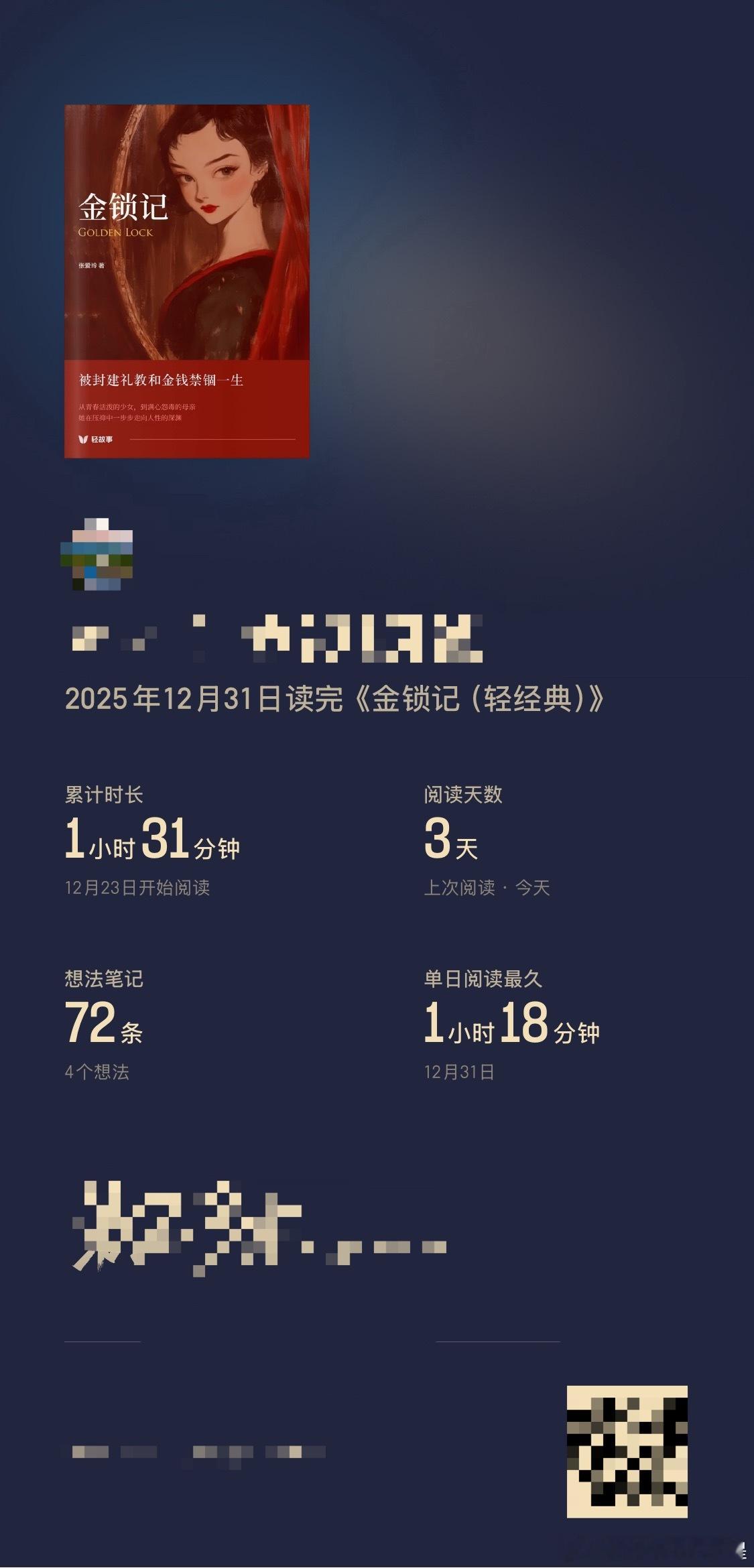 12🈷️书单看文记录 1️⃣《长安的荔枝》之前一直想看,在书架上呆了好久好久,直到电影都上映了,也没看,最近正好出去玩,在路上看完了,写得很有意思,也很借古讽今。2️⃣《布鲁克林有棵树》好像看了很久,看了女主弗朗茜的前半生的感觉,从她和弟弟小时候去卖酒瓶纸箱到她开始努力工作充实人生,从她还是爸爸嘴里的首席女歌手到独当一面的女青年,愿你一切都好,我也很想念我的爸爸3️⃣《金锁记》张爱玲的文笔真的太好了,终于看到了那个经典的镜子十年转场,不得不说是真的很牛啊。故事就是很引人入胜,就想一口气读完,张爱玲也太会写了,那些气味、声音,环境都写得那么好。下午还有事,只能迅速草率地写一点12月的阅读心得了,明年见啦