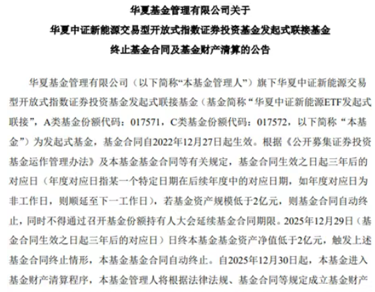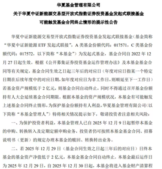 12月30日,华夏中证新能源ETF发起式联接基金正式公告终止运作。此前近两周的清盘预警,并未等来“奇迹注资”,而是加速了资金的离场。对于未能及时退出的持有人而言,除了浮亏,还要共同承担清盘成本。