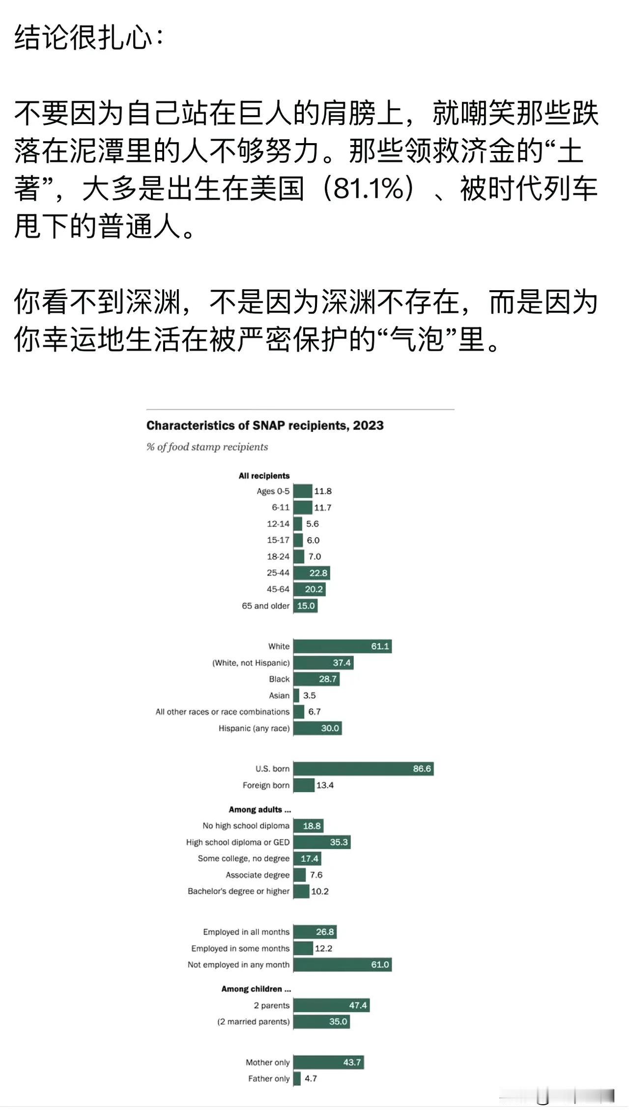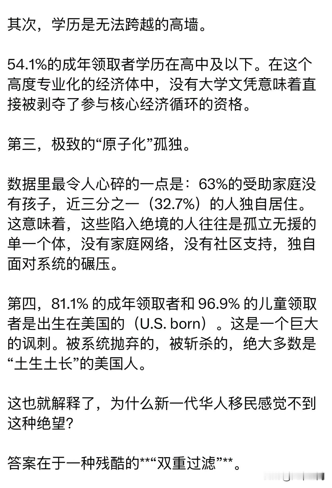 华人博主分析为什么美国华人感受不到斩杀线,实际领食品劵的华裔也不到2%,美国穷人大部分都是白人,美国三亿多人口,有4170万人看领食品劵度日,大部分都是土生土长的美国人! 这个华人博主分析华裔本来能移民进来的都是挑选过的,你要么有钱,要么有才,才能移民美国,而且你有钱或者有才,那你住的地方肯定是在富人区,所以看到被斩杀的流浪汉的几率是更少的,所以感受不到斩杀线!