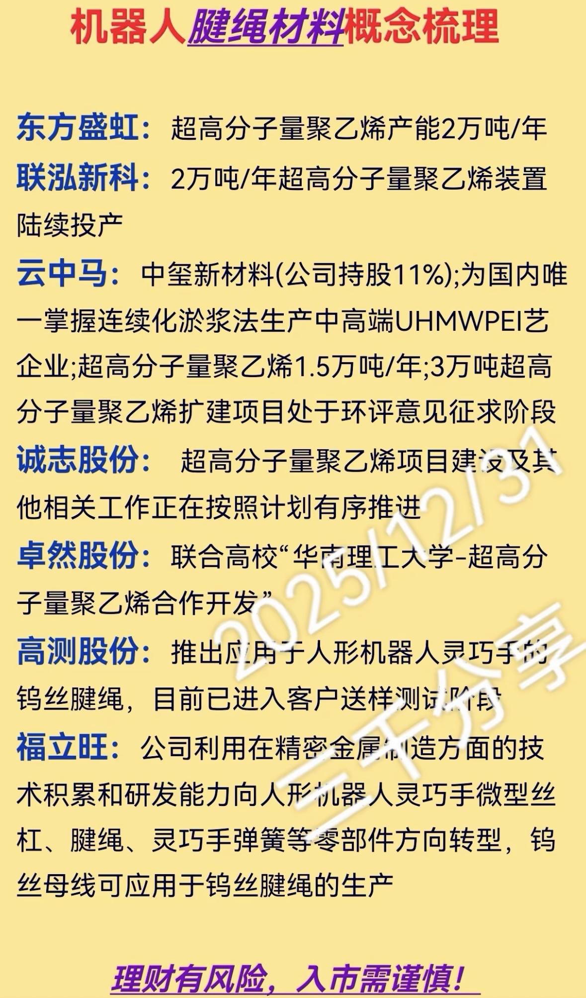 机器人腱绳材料概念梳理, 带你了解前沿科技! 机器人腱绳材料产业链梳理: 美畅专注钨丝金刚线, 鼎龙布局PBO纤维, 绿的谐波供应减速器, 汉威提供传感器, 康隆达与尤夫发力超高分子聚乙烯产能。