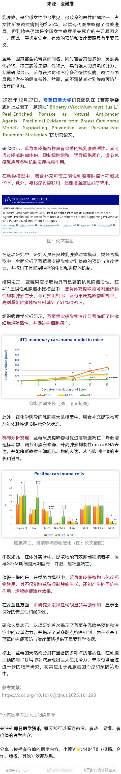 蓝莓竟能抗癌!最新研究:其天然提取物,可使肿瘤缩减91%,并增强癌症治疗效果2025年12月27日,夸美纽斯大学研究团队在《营养学杂志》上发表了一篇题为" Bilberry (Vaccinium myrtillus L.) Peel-Enriched Pomace as Natural Anticancer Agents:Preclinical Evidence from Breast Carcinoma Models Supporting Preventive and Personalized Treatment Strategies "的研究论文。研究显示,蓝莓果皮提取物具有显著的抗乳腺癌活性,其可通过缩减肿瘤体积、抑制细胞增殖、诱导细胞凋亡、调节免疫反应等多种机制发挥抗癌作用。在动物模型中,膳食补充可使三阴性乳腺癌肿瘤体积缩减91%。此外,与化疗药物联用,还能增强癌症治疗效果。
