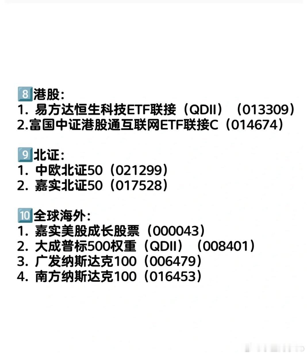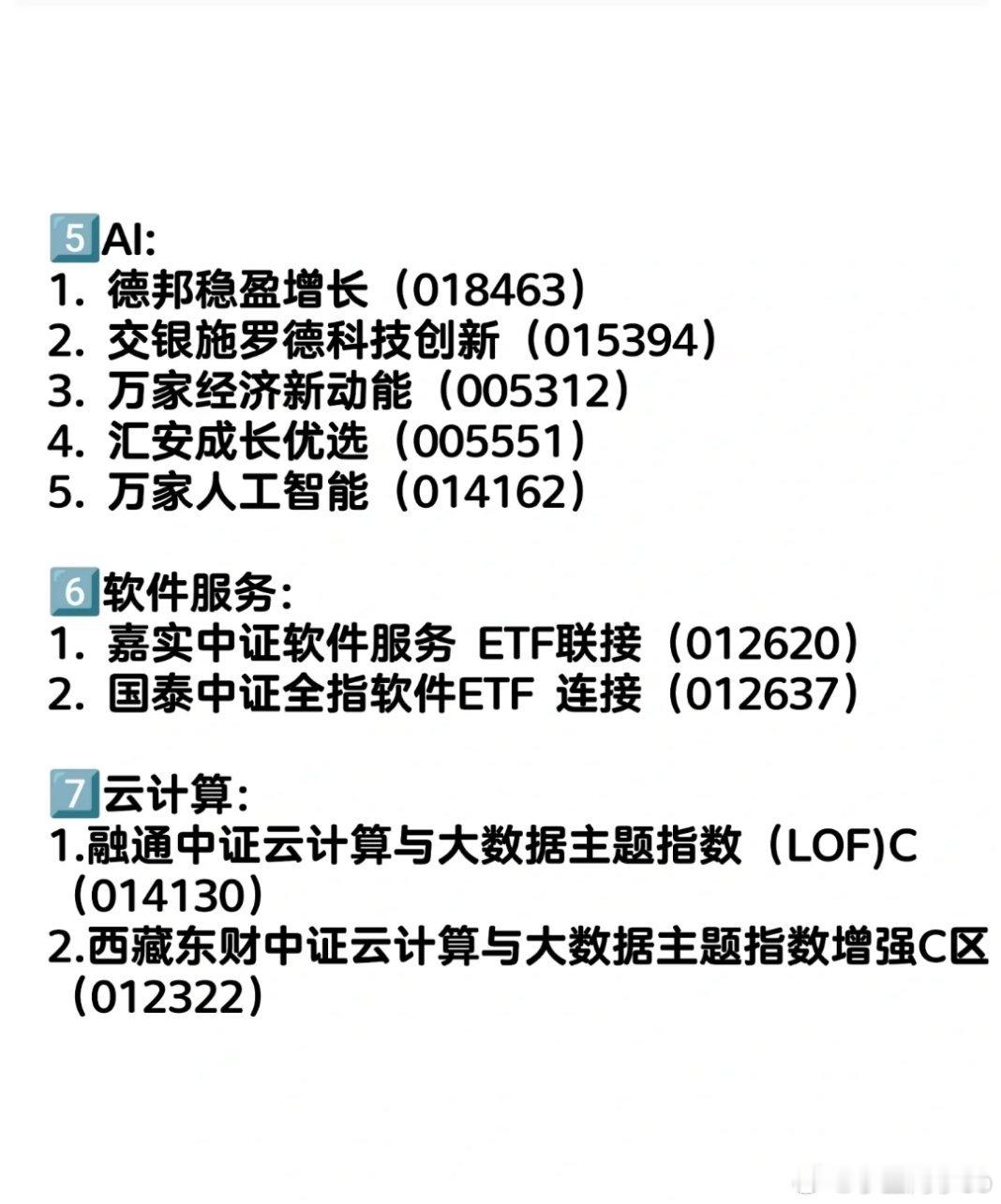 今天聊一聊,A股基金分类get,建议点赞收藏一、机器人:1.永赢先进制造智选混合C (018125)2.鹏华碳中和主题混选C (016531)3.东方阿尔法优选混合C (007519)4.中航趋势领航混合C (021490)5.天弘中证机器人ETF(014881)二、北证:1. 中欧北证50(021299)2. 嘉实北证50(017528)3. 华安北证50(021173)4. 创金合信北证50(019994)三、CPO/算力:1.德邦鑫星价值灵活配置混合C(002112)2.中航机遇领航混合C(018957)3.大摩数字经济混合C(017103)4.天弘中证通信设备指数(020900)四、低空经济:1. 永赢低碳环保(016387)五、AI:1. 德邦稳盈增长(018463)2. 交银施罗德科技创新(015394)3. 万家经济新动能(005312)4. 汇安成长优选(005551)5. 万家人工智能(014162)六、软件服务:1. 嘉实中证软件服务 ETF联接(012620)2. 国泰中证全指软件ETF 连接(012637)七、云计算:1.融通中证云计算与大数据主题指数(LOF)C(014130)2.西藏东财中证云计算与大数据主题指数增强C(012322)八、恒生科技:1. 易方达恒生科技ETF联接(QDII)(013309)2.富国中证港股通互联网ETF联接C(014674)3.华泰恒生科技指数ETF(015311)4.汇添富恒生科技ETF(013128)九、半导体:1. 银河创新成长(014143)2. 德邦半导体(014320)3. 泰信中小盘精选(290011)4. 东方人工智能(017877)5. 永赢半导体产业(015968)6. 诺安优化配置(019571)十、全球海外:1. 嘉实美股成长股票(000043)2. 大成普标500权重(QDII)(008401)3. 广发纳斯达克100(006479)4. 南方纳斯达克100(016453)5.华宝纳斯达克精选(017437)6.南方原油C (006476) 7.博时标普石油油气C(018853)8. 天弘越南C (008764)十一、储存芯片:1.东方阿尔法科技混合(025550)2.永赢先锋半导体(025209)3.德邦半导体产业(014320)十二、港股创新药1.景顺长城中证创新药(023598)2.汇添富国证港股通创新药(021031)3.中银港股通医药混合(020398)4.嘉实互通精选(020232)仅为个人分享,不构成投资建议。