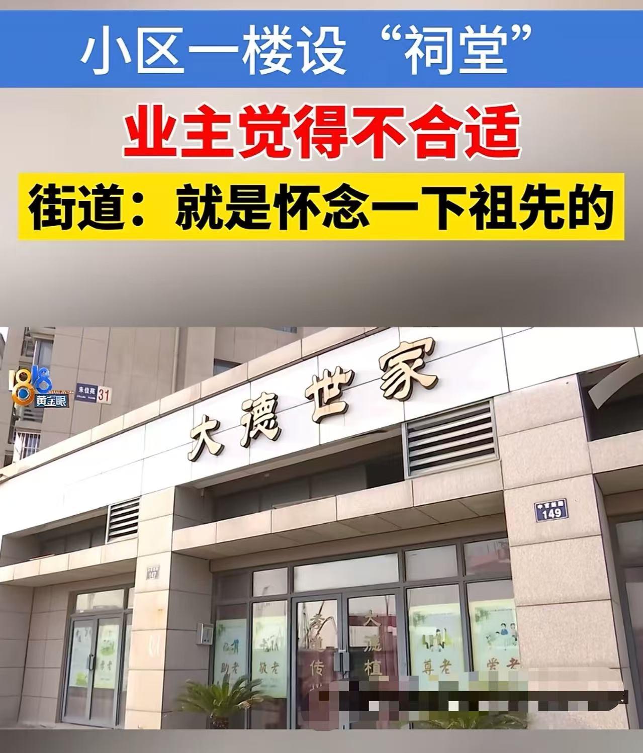 浙江宁波,女子发现小区楼下突然设了一个“祠堂”,冬至当天还有一群人来烧香祭祖,,女子:“活人住的地方,弄个祠堂,这合适吗?希望搬走!”网友:祠堂是家簇的传承,又是整体搬迁安置的,又不在里面办白事,应该谅解,不要太利己了。 杨女士所住的朱家苑是一个回迁安置小区。这个陈家祠堂,就位于小区的商铺位置,一共有三间。招牌上写着“大德世家”,玻璃门上贴着一些尊老爱老的宣传标语。透过玻璃门往里面看,能看到里面摆放着神位、香台、蜡烛等物品。 杨女士说,这个祠堂平常不怎么开门,她也是今年冬至才留意到这个情况,至于是什么时候搬进来的,她也不太清楚,之前一直以为这里是个医馆。 在杨女士看来,小区是人们日常生活的场所,人来人往的,把祠堂放在小区楼下实在不合适,所以她希望祠堂能搬走。 街道的工作人员对此做出了解释。原来,朱家苑当初是由5个村拆迁安置过来的,其中姓陈的村民比较多。这个陈氏宗祠在拆迁的时候,里面存放着不少陈家的历史材料,而且陈家还出了很多名人。 为了保留这些珍贵的资料,就把它们全都搬到了这里。当时还立了一块碑,上面说明了拆迁和搬迁的原因。工作人员还强调,祠堂里没有开展任何经营性的白事或者迷信活动,只是在每年冬至的时候,陈家后人会来怀念祖先、拜祭一下,绝对不会出现什么摆放死人之类的情况。 然而,对于街道工作人员的这一解释,杨女士并不认可。 此事引发热议,有网友说,既然是回迁房,就要尊重当地习俗,这种祠堂肯定是人家村里原来就有,所以回迁后继续存在也没有问题! 也有网友说,好不容易推翻了宗族势力,进入了新中国。有人竟然还在搞这种东西。旧社会靠宗族凝聚血亲,排斥外人,甚至训练乡勇对抗官府。新社会要这种东西干嘛? 同姓的欺负不同姓的? 还有网友说,这个好像没有什么吧,不做亏心事,不怕鬼敲门!有什么好怕的?你不喜欢,你买高档小区就好了! 在我看来,回迁房的建设本质上是对原有村落生活形态的一种延续与重塑,它承载的不仅仅是物理空间上的迁移,更是当地居民情感、文化和习俗的寄托。 每一个村落都有其独特的历史脉络和文化基因,这些文化元素早已深深融入村民们的日常生活和精神世界,成为他们身份认同和归属感的重要来源。 这个出现在小区楼下的陈家祠堂,毫无疑问是村里原有的文化符号。它不仅仅是一个简单的建筑,更是陈氏家族历史记忆的宝库,里面存放着家族的历史材料,见证了家族的兴衰荣辱,也凝聚着族人的情感与精神。 对于陈氏家族的后人来说,祠堂是他们缅怀祖先、传承家族文化的重要场所,是他们心灵的归宿。在回迁安置的过程中,将祠堂保留并迁移至此,是对家族文化的一种尊重和传承,也是对村民情感需求的一种回应。 我们生活在一个多元化的社会,每个人都有自己的生活方式和文化背景。在回迁房这个新的生活空间里,不同姓氏、不同文化背景的居民汇聚在一起,共同开启新的生活篇章。在这种情况下,我们更应该秉持着理解和包容的态度,尊重彼此的文化习俗和生活方式。不能仅仅因为祠堂的存在可能会给自己带来一些不便,就一味地要求其搬走,这种做法无疑是过于利己的。 换个角度思考,如果我们的文化习俗和生活方式不被他人尊重和理解,我们自己又会作何感想呢?我们应该学会换位思考,站在他人的立场上去看待问题。祠堂的存在并没有对小区的整体环境和居民的正常生活造成实质性的破坏,它只是在特定的时间和场合,为陈氏家族的后人提供了一个缅怀祖先、凝聚家族情感的场所。我们应该给予他们这个空间和权利,让他们的家族文化得以延续和传承。